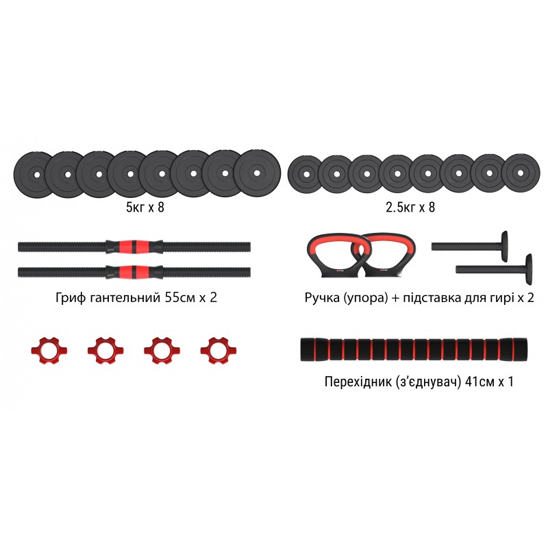 - Штанга: з’єднувальний стрижень дозволяє зібрати повноцінну штангу.
