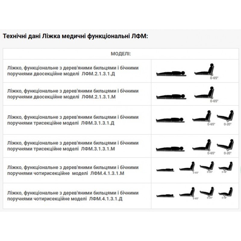 Ліжко, функціональне Норма-Трейд з дерев'яними бильцями і бічними поручнями трисекційне моделі, код: ЛФМ.3.1.3.1.Д