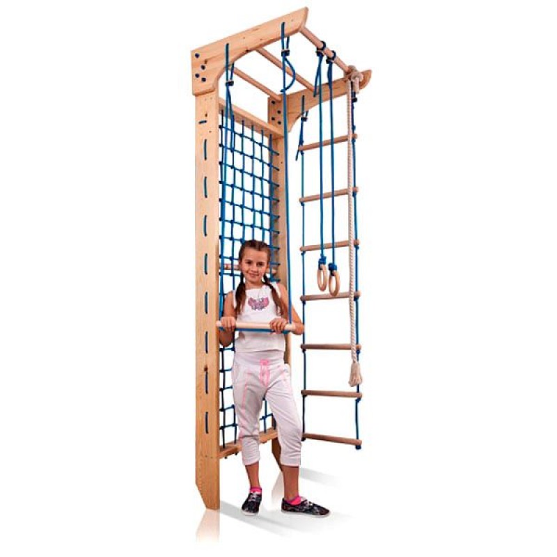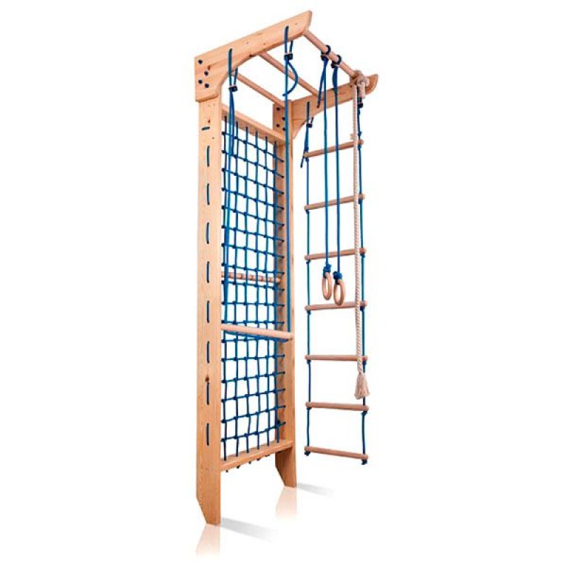 використовувані при виготовленні спортивного обладнання, абсолютно безпечні для дитини і дозволяють не турбуватися про збереження сприятливої ​​атмосфери в просторі дитячої кімнати. Вибираючи найкращі товари для своїх дітей, ви робите внесок в їх майбутнє! Плетіння сітки з гіпоаллергічного поліпропілену, що відрізняється високою міцністю. Виступ турніка вперед: 75 см. Необхідна висота приміщення: 2,60 & ndash; 3 м. Допустимі навантаження на навісне: 80 кг. Допустимі навантаження на спорткуток: 130 кг. Колір: натуральне дерево.