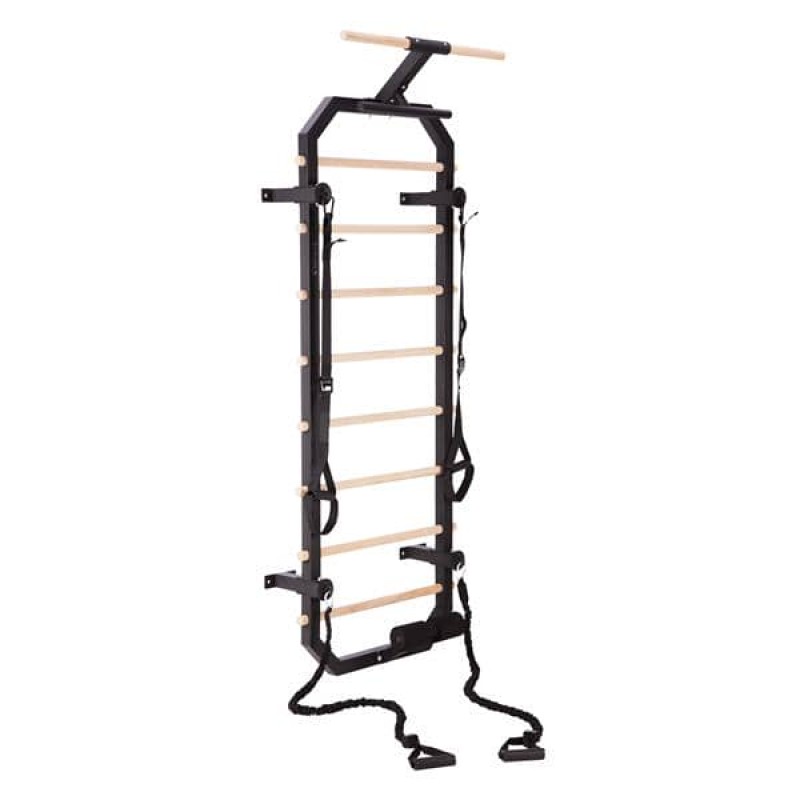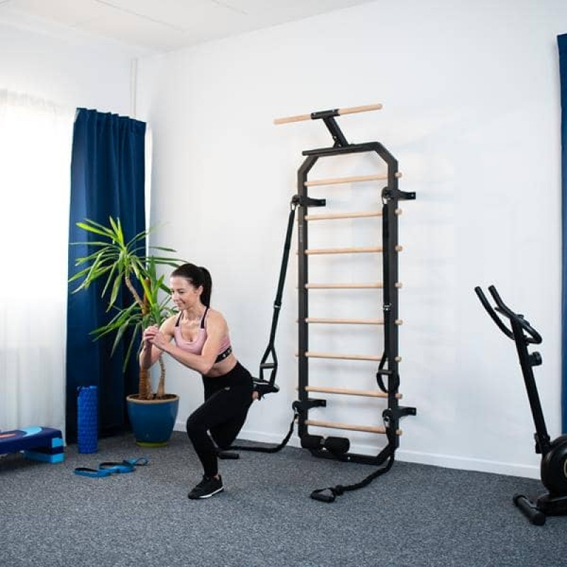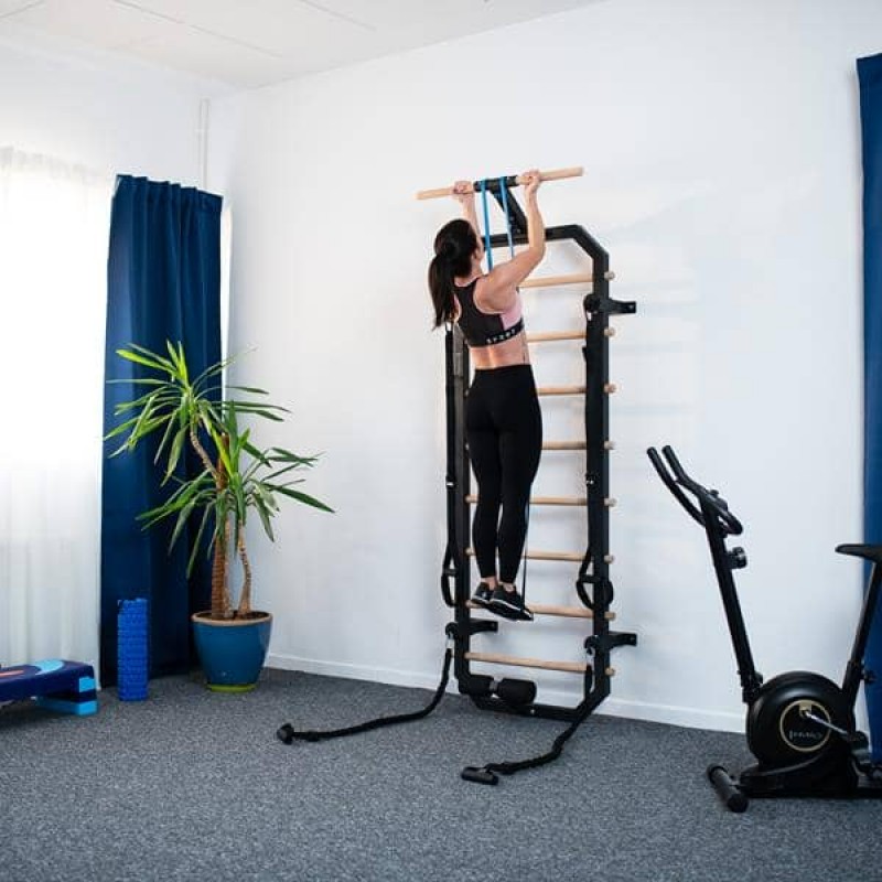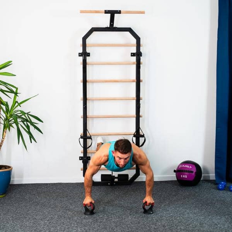 Багатофункціональна драбина DW2708 - ідеальне рішення для людей, які хочуть займатися вдома. Набір складається з гімнастичної драбини, яка кріпиться до стіни, а також спеціальних гумок і стрічок. Виріб виготовлений з високоякісної сталі та має 8 сходинок з деревини бука. Висота драбини становить 223 см, а ширина - 80 см, тому на ній може займатися будь-яка людина. Багато можливостей Набір DW2708 дозволяє виконувати різноманітні вправи для всього тіла, такі як підтягування, піднімання ніг, скручування тулуба тощо. Такі тренування збільшують діапазон руху суглобів і запобігають травмам. Кількість вправ практично необмежена, оскільки для тренувань можна використовувати еластичні стрічки та гумки. Набір DW2708 легко збирається та розбирається. Це чудовий спосіб покращити фізичну форму, силу, гнучкість та здоров'я в комфортних умовах власного будинку. Ремені та еластичні стрічки в комплекті Гімнастична драбина HMS - це не лише чудовий тренажер для силових вправ та вправ на розтяжку, але й набір аксесуарів, які розширюють можливості тренувань. До комплекту входять стрічки та резинові гумки для задіяння різних частин м'язів. Стрічки виготовлені з міцного матеріалу для забезпечення безпеки та комфорту під час тренувань. Їх можна регулювати по довжині. Резинки - це якісні гумові стрічки, які при розтягуванні впливають на інтенсивність вправи. І стрічки, і резинки легкі та зручні для зберігання. Естетика і дизайн DW2708 виглядає дуже естетично і вписується в будь-який інтер'єр. Гімнастична драбина має елегантний дизайн. Поєднання чорного кольору та дерев'яних балок робить DW2708 гармонійною на будь-якій стіні. Гімнастичні ремені та гумки також виконані в чорному кольорі. Набір DW2708 - це не тільки тренажер, але й прикраса для дому. Технічні характеристики: Матеріал: Q235 + деревина бука Загальна висота: 223 см Висота рами: 205 см Ширина рами: 64 см Довжина перекладини: 80 см Відстань між перекладинами: 19,5 см Відстань рами від стіни: 14,2 см Загальна відстань від стіни: 46 см Довжина гумки: 120 - 400 см Довжина ременя: 105 - 145 см Опора для ніг: 34 см Ширина нижньої перекладини: 45,5 см Максимальна вага користувача: 300 кг Примітки: Не для комерційного використання Гарантія 24 місяці