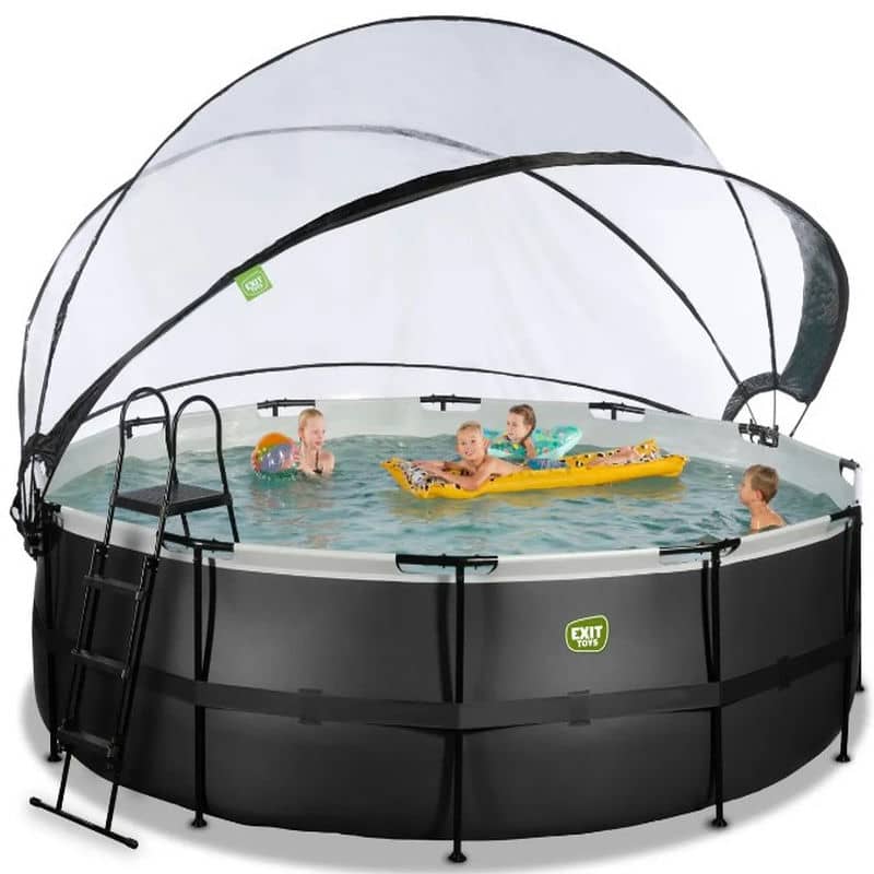 Басейн Exit круглий з куполом 450х122 см + тепловий насос + пісочний фільтр "дерево" виглядає лаконічно і елегантно. Із зовнішнього боку - тканину із забарвленням у вигляді дерев'яної стіни, що зробить його розміщення в саду, на дачі або у дворі будинку особливо естетичним.