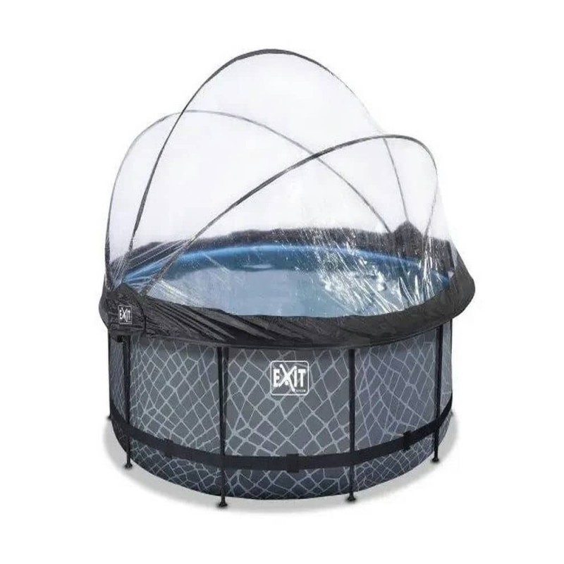 Басейн EXIT каркасний круглий з куполом 360х122 см + тепловий насос + пісочний фільтр "камінь" виглядає лаконічно і елегантно. Із зовнішнього боку - тканину із забарвленням у вигляді дерев'яної стіни, що зробить його розміщення в саду, на дачі або у дворі будинку особливо естетичним.