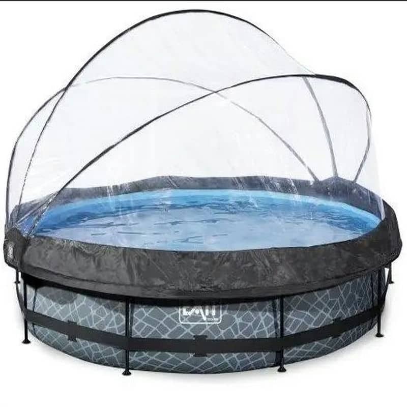Басейн круглий з куполом EXIT камінь 360 х 76 см виглядає лаконічно і елегантно. З зовнішньої сторони - тканина з візерунком у вигляді кам'яної стіни, що зробить його розміщення в саду, на дачі або у дворі будинку особливо естетичним.