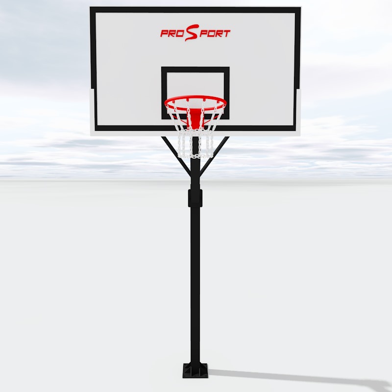 Баскетбольна стійка виготовлена з профільної труби 120 х 120 х 3 мм. Монтаж стійки проводиться на попередньо бетоновану заставну за допомогою болтів. При виробництві стійка проходить піскоструминну обробку і фарбується полімерно-порошковим способом. Основний колір чорний, але під замовлення можливі і інші кольори. Кронштейн для кріплення щита виготовлений з профільної труби 100 х 100 х 3 мм. Завдяки спеціальній системі кріплення, кронштейн можна фіксувати на стійці на різних висотах, тим самим регулюючи висоту від поверхні майданчика до кільця від 2,5-х метрів до 3,05 м. Довжина кронштейна теж може бути різною в залежності від розмірів майданчика і побажань замовника. Максимальний виліт від стійкі до щита 1500 мм.