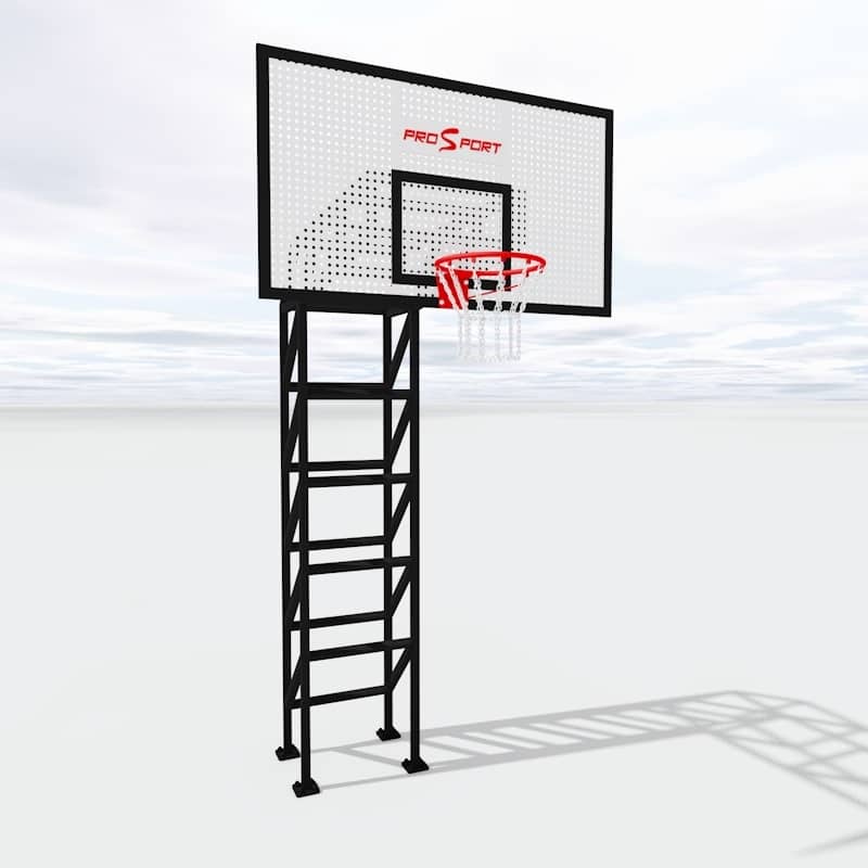 Баскетбольна стійка являє собою металеву конструкцію з чотирьох опор, з’єднаних між собою перемичками. Опори і перемички виготовлені з профільної труби 50х50х2 мм. Монтаж стійки проводиться на попередньо бетоновану заставну за допомогою болтів. При виробництві стійка проходить піскоструминну обробку і забарвлюється полімерно-порошковим способом. Основний колір чорний, але під замовлення можливі і інші кольори.