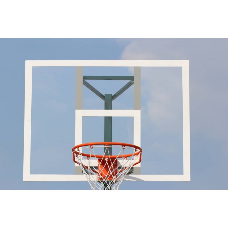 Баскетбольний щит виконаний з оргскла товщиною 10 мм, з силовою антивібраційною металевою рамою для вулиці і спортивного залу. Кошик і сітка в комплект не входять. Щит являє собою панель із спеціального оргскла, закріплений на силовий антивібраційної металевій рамі по периметру, за допомогою гвинтів. Між рамою і панеллю знаходиться гумова прокладка, яка пом'якшує вібрації панелі при ударі м'ячем і захищає її від пошкоджень. Кріплення кошика зроблено таким чином, щоб перешкоджати тиску кошика на панель щита. З цією метою створені металеві втулки в отворах панелі довжиною більше, ніж товщина панелі. Для кріплення щита до ферми або інших конструкцій, на рамі передбачені два вертикальних паза кріплення, які дозволяють після установки щита проводити його регулювання в межах 250 мм, з метою забезпечення висоти баскетбольного кошика над поверхнею підлоги - 3,05 м. Рама має порошкове покриття білого кольори.