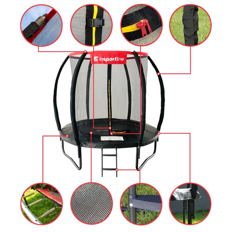 Інша частина батута також безпечна. Пружини, які утримують батут, приховані під захисним кожухом, а стовпи сітки оббиті рукавами з пінопласту. Протиковзка драбина дозволяє безпечно піднятися на батут, а вхід фіксується не тільки блискавкою, але і пряжками. Завдяки діаметру 183 см цей батут ідеально підходить для вашого саду. Якщо ви хочете розважити непосидючих членів сім'ї (включаючи дорослих), батутний набір inSPORTline Flea PRO 183 см - це ваш шлях!