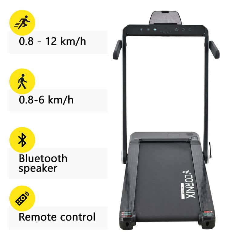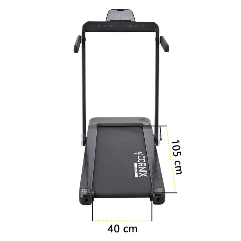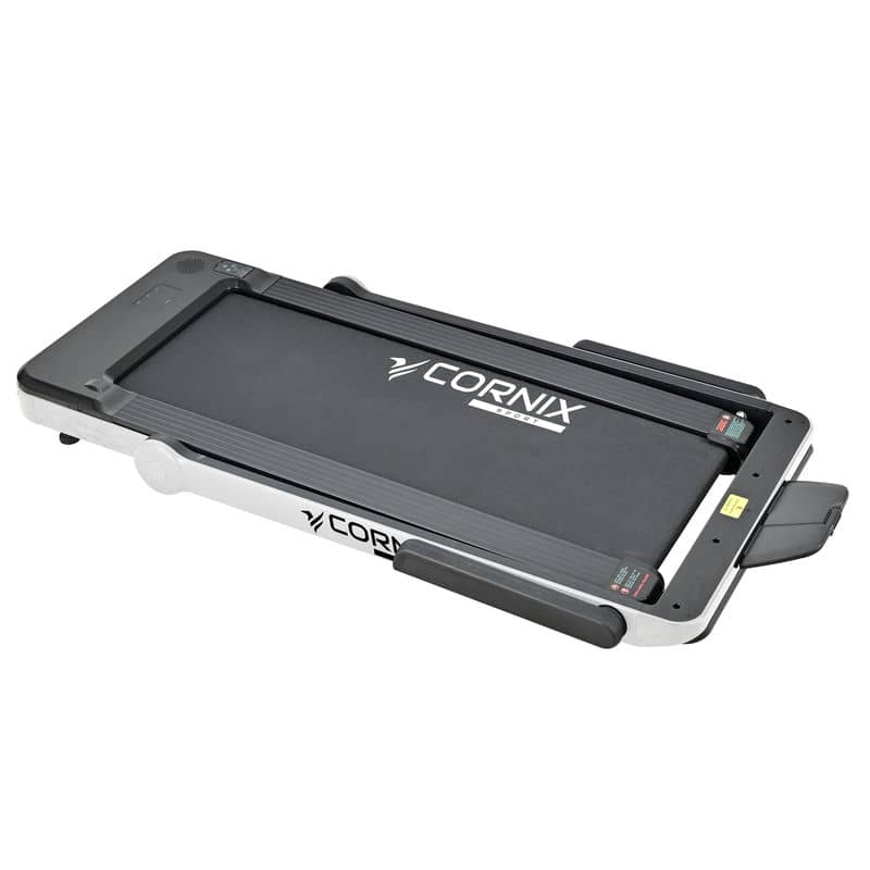 Бігова доріжка від Cornix оснащена новітнім енергоефективним двигуном на 1.5 к.с. з піковою потужністю до 2.5 к.с., він здатний забезпечити швидкість руху в діапазоні від 0.8 до 12 км/год. Бігове полотно тренажера має некозвку структуру та підвищену стійкість до зношення, його розміри складають 40 x 105 см. Ефективна система амортизації Cushion Absorb System відмінно поглинає удари, чим зменшує навантаження на суглоби та хребет. Доріжку можна використовувати у двох положеннях: класичному, з розкладеними поручнями та управлінням через центральну консоль, а також в складеному вигляді, з опущеними поручнями та керуванням через пульт ДУ.