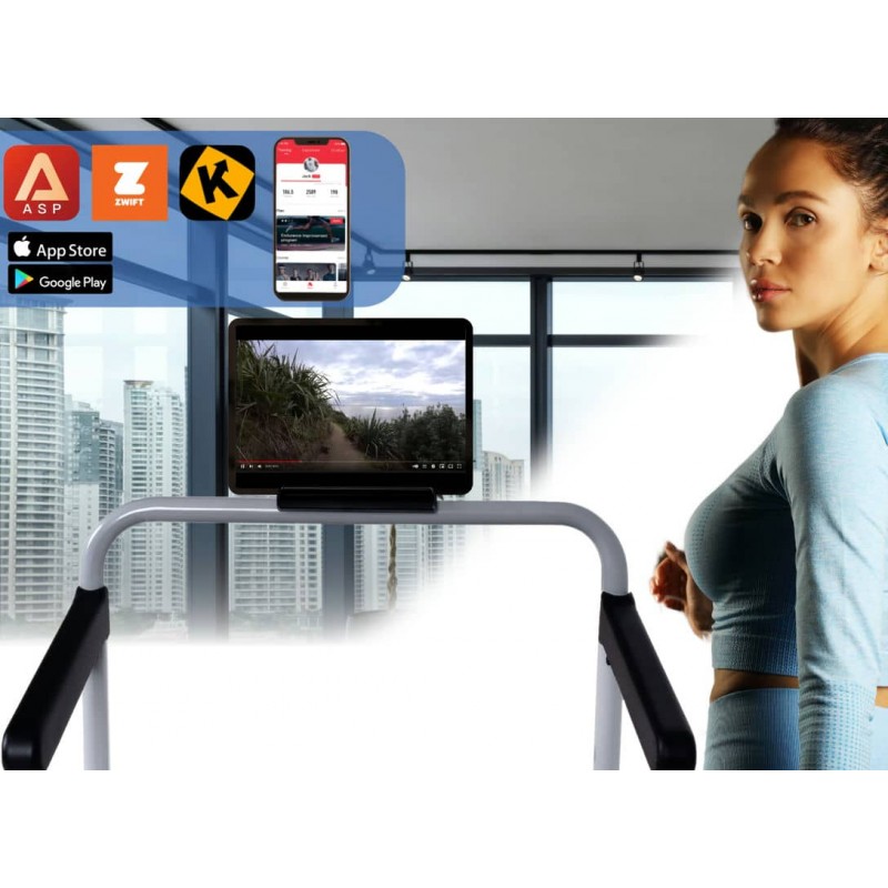 В штатних можливостях тренажера передбачено 12 вбудованих програм, а також одна індивідуальна; контроль всіх основних показників, таких як: час, швидкість, дистанція, спалені калорії. Магнітний ключ безпеки зупинить бігове полотно в разі, якщо ви раптово втратите рівновагу. Інтегровані динаміки дозволяють підключати ваш мобільний пристрій по bluetooth та насолоджуватись прослуховуванням музики чи аудіокниг під час тренування. Якщо ж даних можливостей вам буде не достатньо, то пристрій сумісний з популярними додатками, такими як: FITIME, Kinomap та ZWIFT, де ви зможете створювати власні режими, обирати реальні маршрути з усього світу та ділитися своїми результатами з друзями й іншими користувачами.