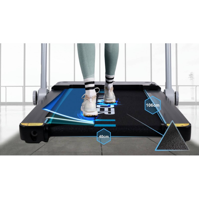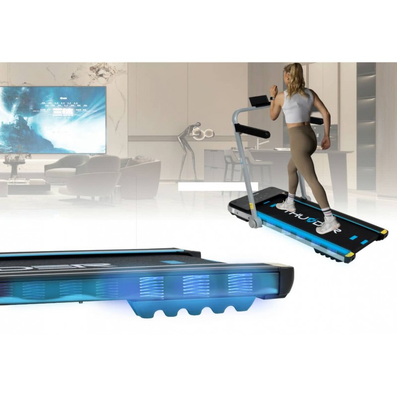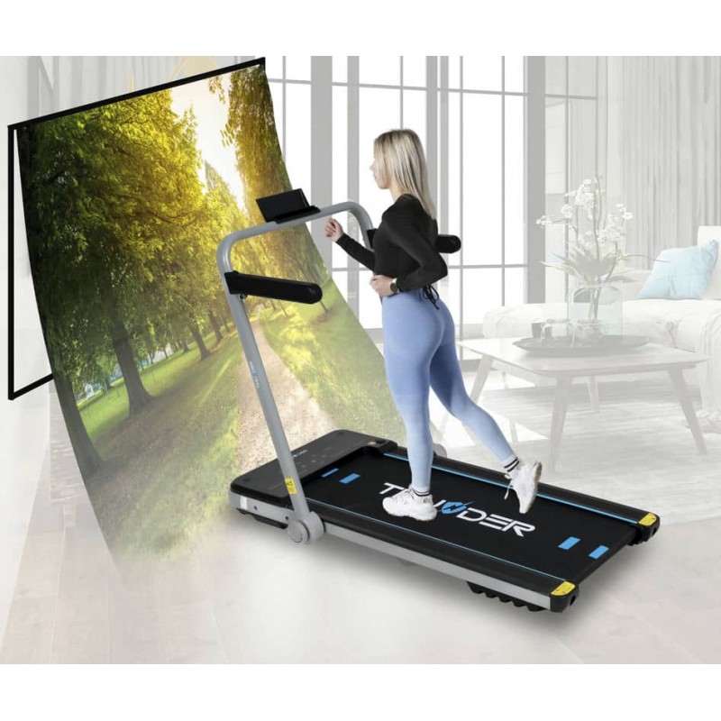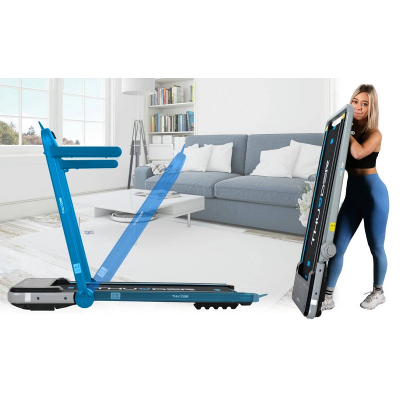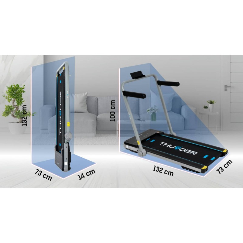 Бігова доріжка від THUNDER оснащена новітнім енергоефективним двигуном на 1.5 к.с. з піковою потужністю до 3 к.с., він здатний забезпечити швидкість руху в діапазоні від 1 до 12 км/год. Трикомпонентне бігове полотно має некозвку структуру та підвищену стійкість до зношення, його розміри складають 40 x 106.5 см. Cистема амортизації поглинає удари та зменшує навантаження на суглоби і хребет. Доріжку можна використовувати у двох положеннях: класичному - з розкладеними поручнями та управлінням через центральну консоль, а також в компактному вигляді - з опущеними поручнями та керуванням через пульт ДУ.