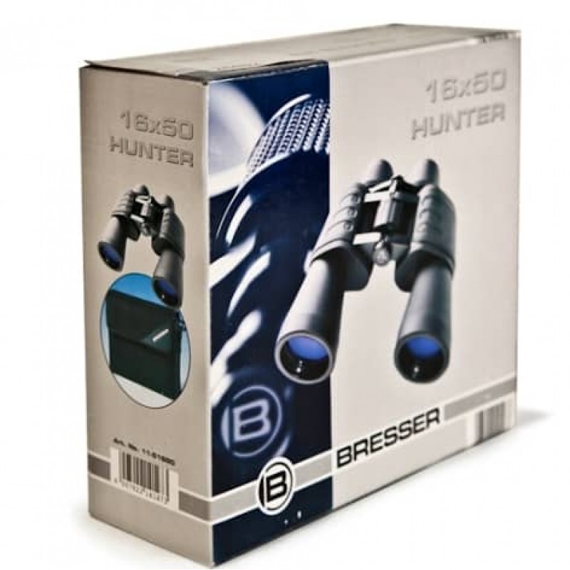 Біноклі серії HUNTER - прилади широкого цільового призначення. Володіючи гідними оптичними якостями, вони також доступні за ціною. Даная серія біноклів зручна як для прогулянкових спостережень, турпоходів, виїздів на полювання, так і для спостережень за живою природою і за спортивними змаганнями. Бінокль BRESSER HUNTER 16x50 має прогумований, ударостійким корпус. Спеціальне стійке до стирання, антибликовое, повне покриття, що просвітлює лінз блакитного відтінку захищає від подряпин і сприяє максимальному проникненню світла (не менше 75%), а призми, зроблені зі скла BK7, дозволять отримати більш якісну і контрастну картинку на окулярі. Різкість зображення регулюється центральним колесом, крім того передбачена можливість корекції діоптрія за допомогою кільця на правому окулярі, щоб підлаштувати прилад під індивідуальні особливості зору. Також можливо відрегулювати міжосьова відстані для максимально комфортного спостереження. При схожих оптичних характеристиках поле зору цього бінокля перевершує аналогічні моделі інших виробників і при цьому збережені компактні розміри і невелику вагу. Є гніздо для кріплення штатива, що практично необхідно для отримання стабільного статичного зображення при даній кратності. Кришки для окулярів і об'єктива, м'який кейс і ремінь дозволять захистити бінокль від зовнішніх ушкоджень при транспортуванні.