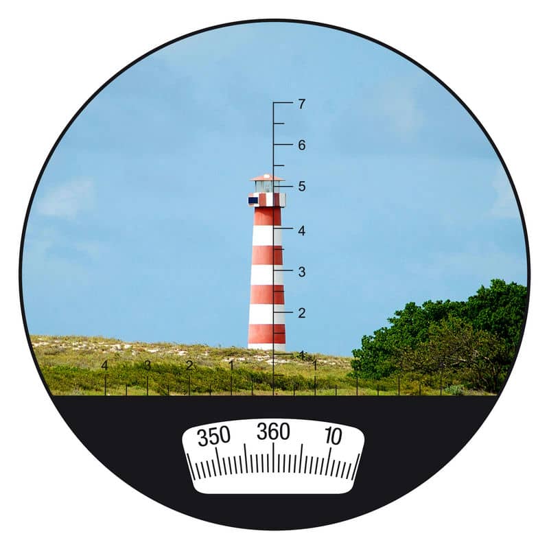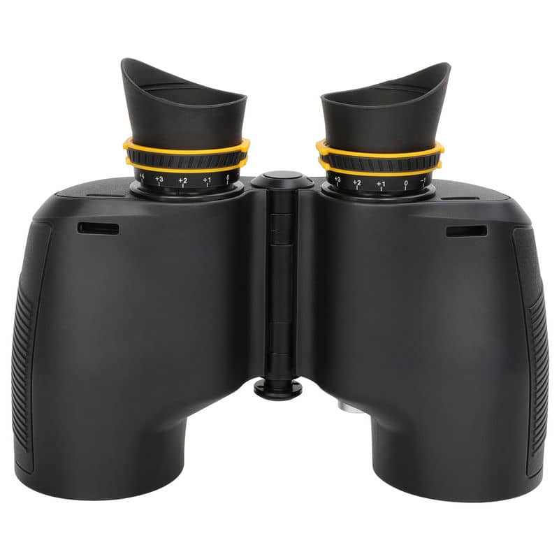 - Інтегрований компас із підсвічуванням. Одна з основних особливостей цієї моделі – вбудований аналоговий компас. Коли Ви дивитеся в бінокль, по нижньому краю зору знаходиться шкала в градусах (від 0° до 360°). Коли всередині шкали позначено 360, це означає, що Ви дивитеся на північ. Якщо – 180, то на південь. Для умов низького освітлення на зовнішній стороні корпусу розташована кнопка, що включає підсвічування компаса. Підсвічування працює від елементів живлення, які слід регулярно замінювати для підтримки працездатності приладу. Елемент живлення у комплекті: LR936 1,5V (LR45/AG9) - 2 шт