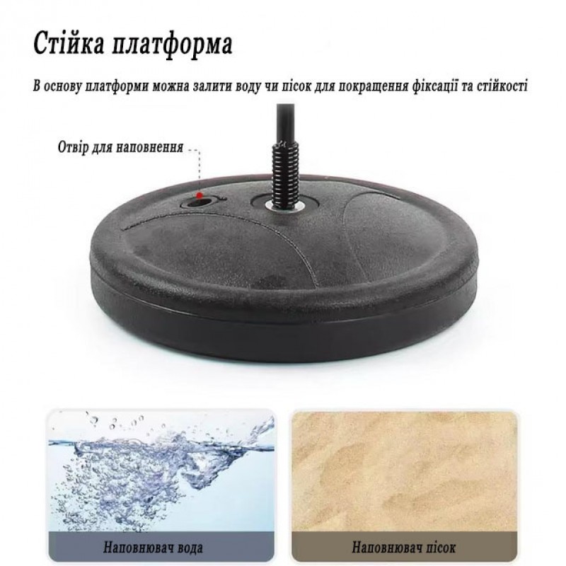 У комплекті цього боксерського набору йде спеціальна надувна груша, яка встановлюється на міцній металевій стійці. Стійка закріплена на надійній та стійкій основі, яку можна заповнити водою, піском або будь-яким іншим наповнювачем для збільшення стійкості. Це робить боксерський набір безпечним у використанні як у приміщенні, так і на вулиці.