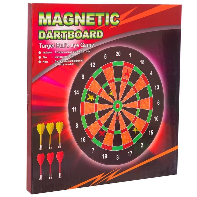 Отримайте велике задоволення від цієї магнітної мішені для дартсу, просто повісивши її на будь-які двері або настінний гачок і почавши грати. Гравці мають кидати дротики в дошку, щоб набирати очки залежно від того, куди вони потрапили. Оскільки дротики магнітні, то вони абсолютно безпечні, і до гри в дартс можна долучити дітей.