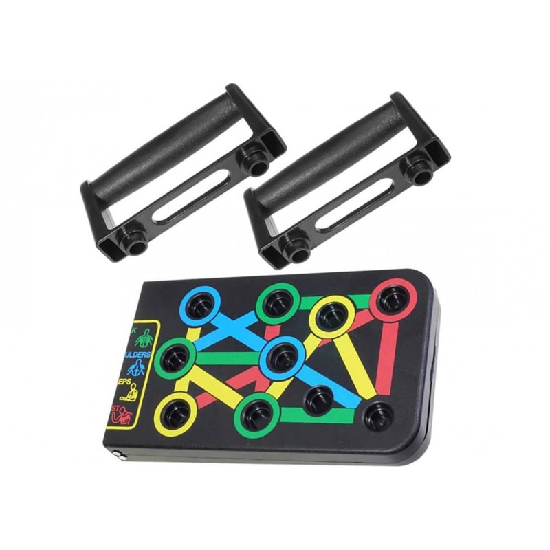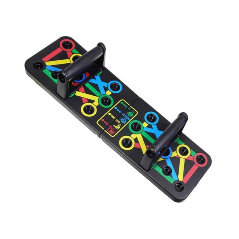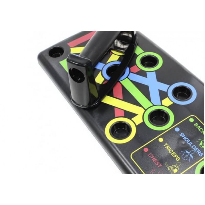 Дошка для віджимань із різнобарвною розміткою допомагає ефективно тренувати та зміцнювати верхню частину тіла. Переміщуючи ручки відповідно до розмітки, можна акцентувати навантаження і розвивати різні групи м'язів. Кожен колір розмітки відповідає певній групі м'язів: синій для плечей, жовтий для трицепсу, червоний для грудей та зелений для спини.