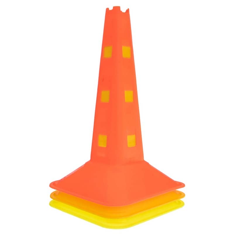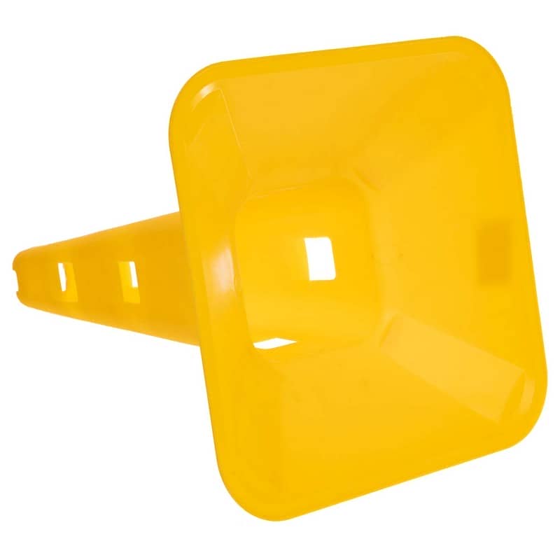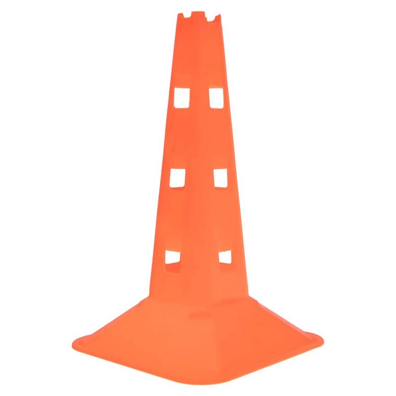 Тренувальна фішка-конус - це мультиспортивний інвентар, який можна використовувати для розмітки трас, майданчиків чи полів, а також для проведення спортивних заходів. Фішка виготовлена із пластику та має висоту 38 см. Конструкція виконана у вигляді усіченого конуса з отворами, розташованими на різній висоті. У верхній частині є паз, призначений для встановлення вертикальної або горизонтальної поперечини. Отвори на гранях дають змогу встановлювати бар'єр між двома конусами, а також вибирати його висоту. Основа ширша, ніж верхня частина, і має прямокутну форму, що забезпечує стійкість на різних поверхнях. Конструкція не потребує спеціального кріплення.