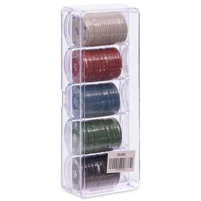 Для виготовлення фігурок використовується щільний, твердий пластик, що характеризується стійкістю до механічних пошкоджень та зносу. У процесі виробництва їх ретельно калібрують, тому вони абсолютно ідентичні за розміром та вагою. На фішки нанесені цифри (номінал), що вказують на їх умовну вартість, при цьому кожному номіналу відповідає певний колір, що дозволяє уникнути плутанини під час гри. Для зберігання набору передбачено пластиковий бокс, що знижує шанси втратити фішки в процесі експлуатації.