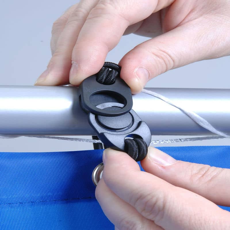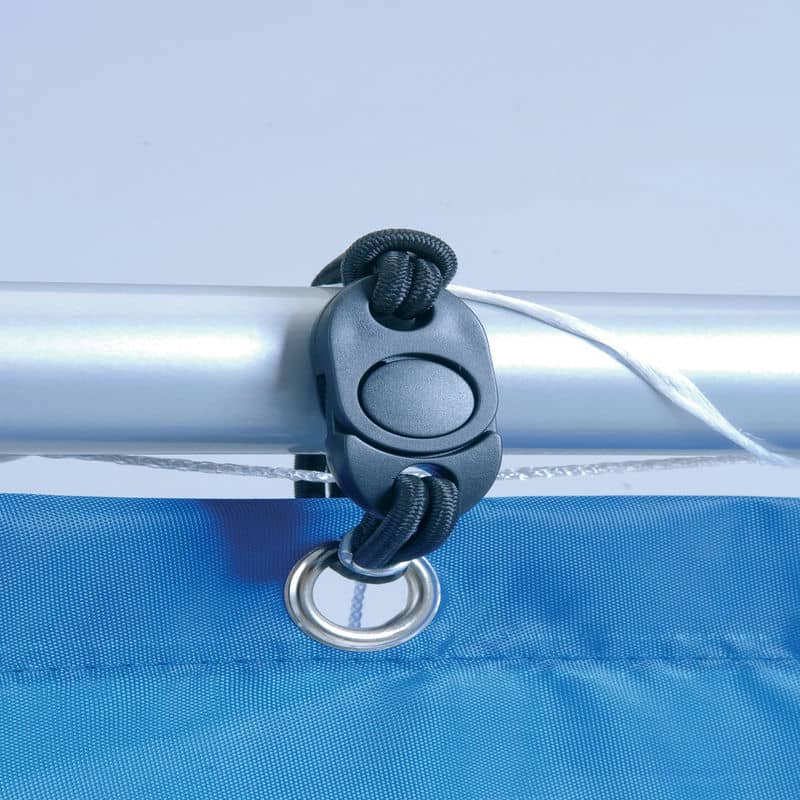 - Біла поліестерова сітка для зовнішнього використання, стійка до УФ-променів, із подвійною системою кріплення до рами: за допомогою мотузки по периметру та текстильних застібок Velcro.
