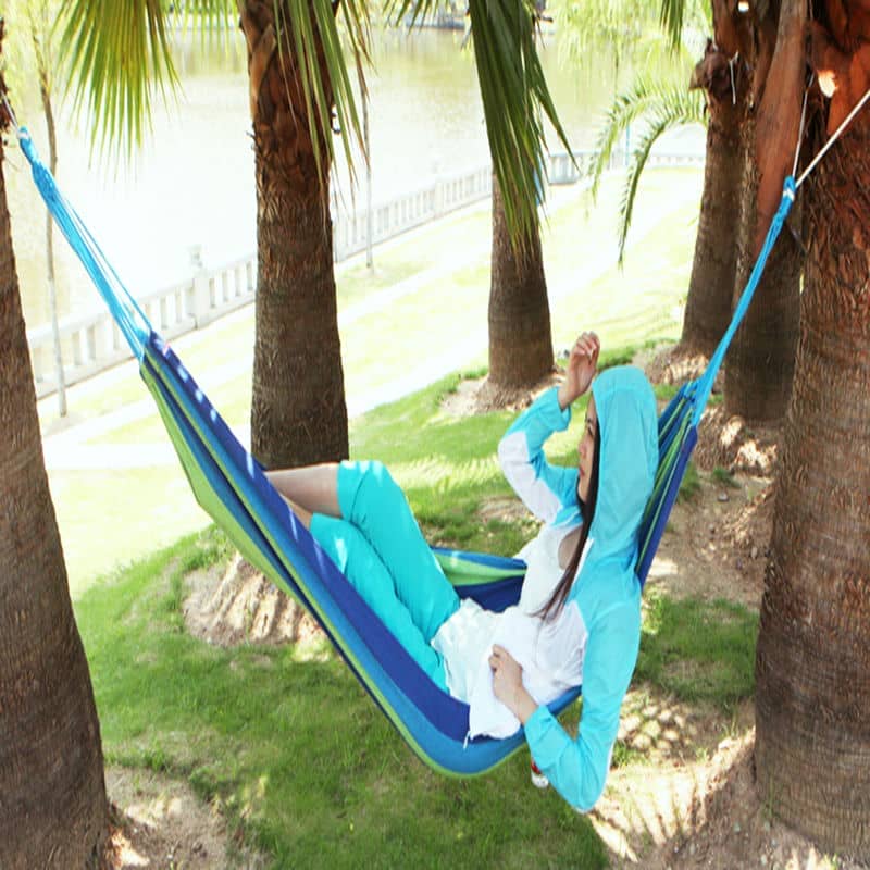 Тканинний бавовняний підвісний гамак простий та зручний в експлуатації. З боків є еластичні петлі, сплетені з бавовняних мотузок. Ви можете зафіксувати гамак як на гілках дерев, так і на стйіках для гамаків, або протягнути додаткові мотузки ті обв’язати дерево. В комплект входять мотузки для закріплення на дерево, та додатково металеві гачки для швидкого вдягання та знімання гамаку.