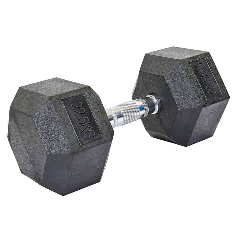 Гантель являє собою пару шестикутних призм, з'єднаних між собою ручкою для захоплення. Щоб снаряд не вислизав з рук, на гриф нанесені насічки. Він сам виконаний з хромованою стали, тому не іржавіє і довго зберігає відмінний зовнішній вигляд. Шестигранники обрезинени, а значить, не створюють сильного шуму при укладанні їх на стійку або на підлогу. Гумовий шар також захищає підлогове покриття від пошкодження, якщо гантель неакуратно покласти. P>