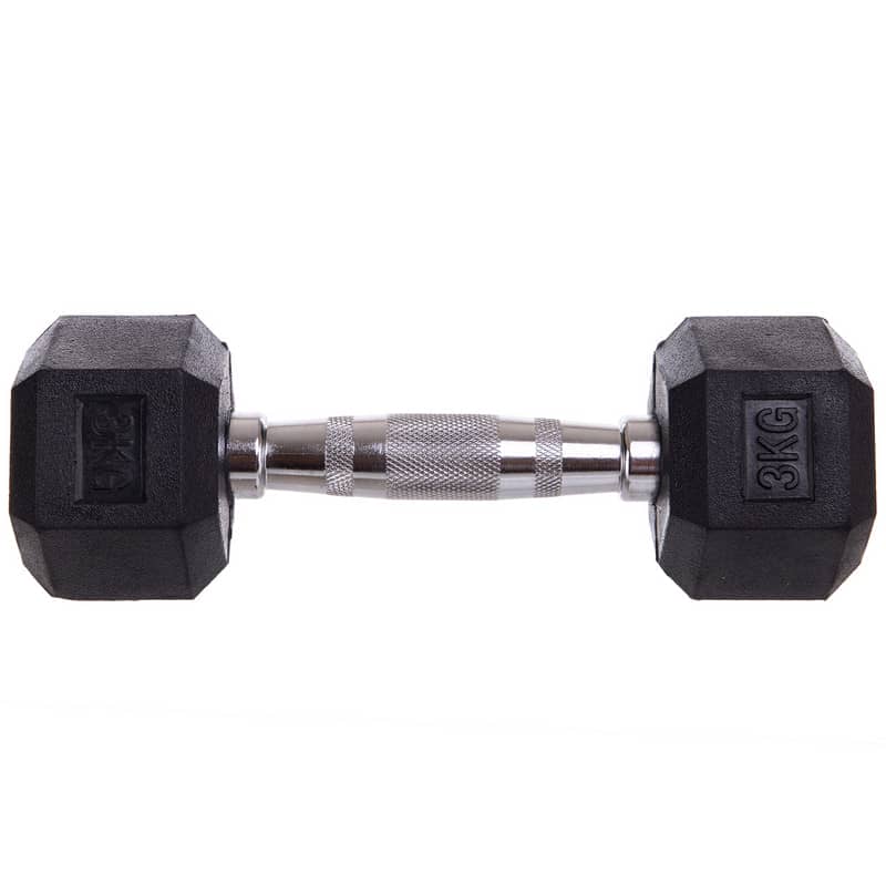 Гантель являє собою пару шестикутних призм, з'єднаних між собою ручкою для захоплення. Щоб снаряд не вислизав з рук, на гриф нанесені насічки. Він сам виконаний з хромованою стали, тому не іржавіє і довго зберігає відмінний зовнішній вигляд. Шестигранники обрезинени, а значить, не створюють сильного шуму при укладанні їх на стійку або на підлогу. Гумовий шар також захищає підлогове покриття від пошкодження, якщо гантель неакуратно покласти. P>