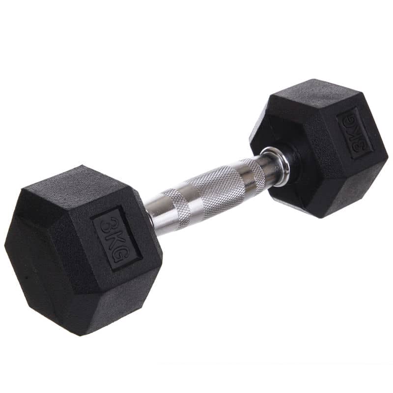 Гантель являє собою пару шестикутних призм, з'єднаних між собою ручкою для захоплення. Щоб снаряд не вислизав з рук, на гриф нанесені насічки. Він сам виконаний з хромованою стали, тому не іржавіє і довго зберігає відмінний зовнішній вигляд. Шестигранники обрезинени, а значить, не створюють сильного шуму при укладанні їх на стійку або на підлогу. Гумовий шар також захищає підлогове покриття від пошкодження, якщо гантель неакуратно покласти. P>