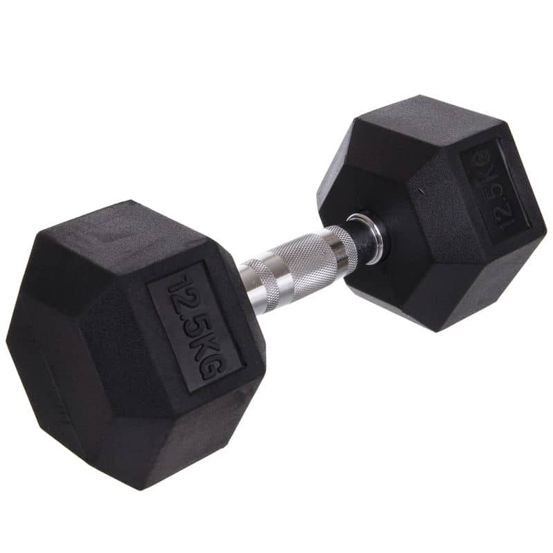Гантель являє собою пару шестикутних призм, з'єднаних між собою ручкою для захоплення. Щоб снаряд не вислизав з рук, на гриф нанесені насічки. Він сам виконаний з хромованою стали, тому не іржавіє і довго зберігає відмінний зовнішній вигляд. Шестигранники обрезинени, а значить, не створюють сильного шуму при укладанні їх на стійку або на підлогу. Гумовий шар також захищає підлогове покриття від пошкодження, якщо гантель неакуратно покласти. P>