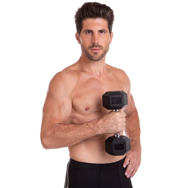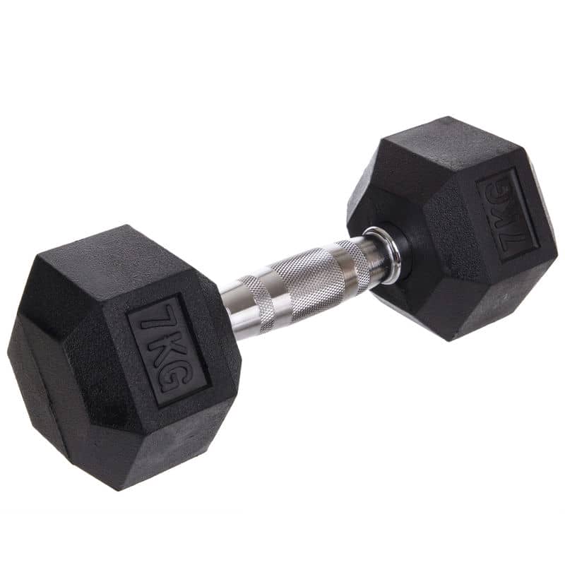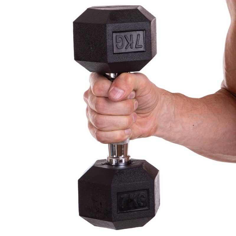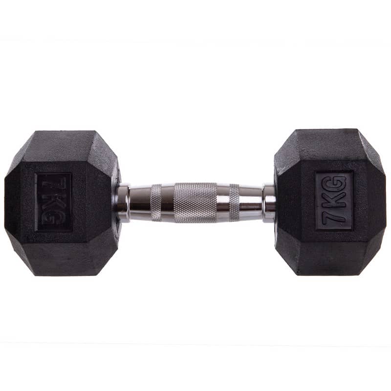 Гантель являє собою пару шестикутних призм, з'єднаних між собою ручкою для захоплення. Щоб снаряд не вислизав з рук, на гриф нанесені насічки. Він сам виконаний з хромованою стали, тому не іржавіє і довго зберігає відмінний зовнішній вигляд. Шестигранники обрезинени, а значить, не створюють сильного шуму при укладанні їх на стійку або на підлогу. Гумовий шар також захищає підлогове покриття від пошкодження, якщо гантель неакуратно покласти. P>