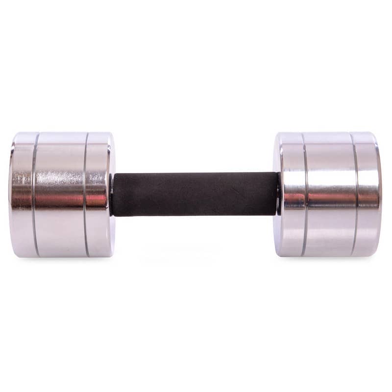 Особливість цієї моделі полягає в неопреновій ручці – ваш хват буде максимально впевненим, рука не зісковзне. Гантель має класичну форму, виконана з хромованого металу, який перешкоджає іржавінню, а отже, снаряд довго зберігатиме товарний зовнішній вигляд. Ручка неопренова, тому як би ви не взяли гантель – вона не вислизне з долоні. Конструкція цільно лита, має короткий сучасний вигляд. Млинці виготовлені у формі циліндрів, через кожен з яких по всьому колу проходить пара фактурних кілець. У гантелі плоскі торці, за бажання її можна поставити вертикально.