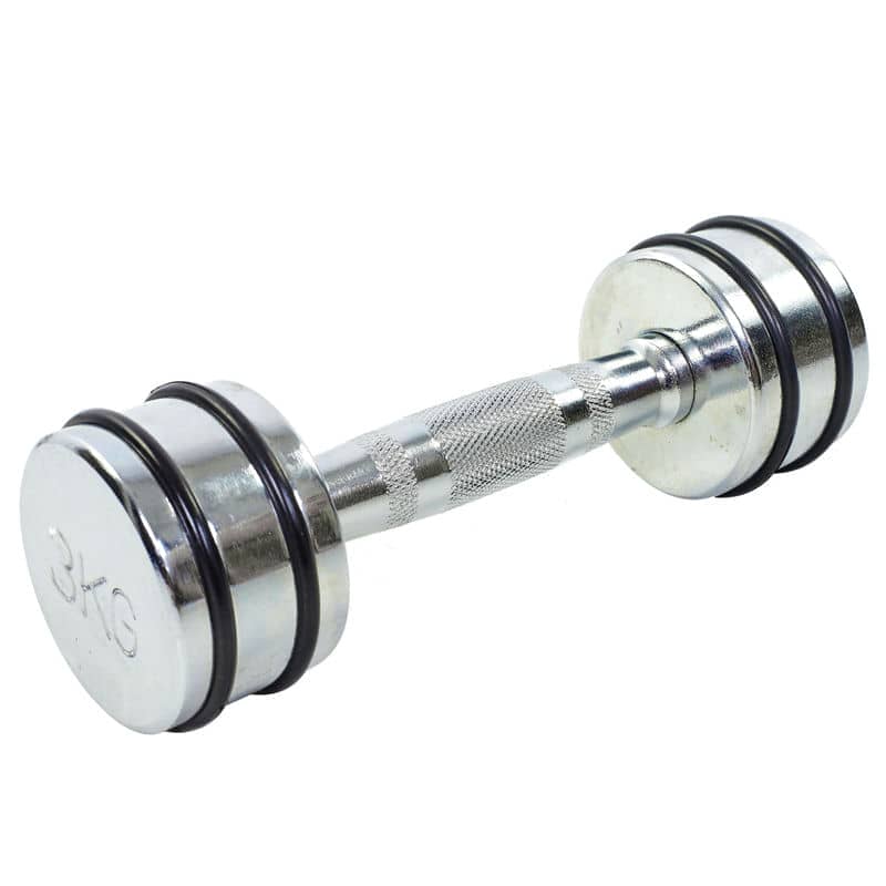 Гантель для фітнесу хромована DB5204-3 (1x3кг) - відрізняється тим, що на кожному циліндрі-набалдашнику є по два опуклих кільця. Вони потрібні для кращого зчеплення з поверхнею, щоб снаряди не розкочувати по підлозі. А ще вони глушать звук при випадковому падінні снаряда.