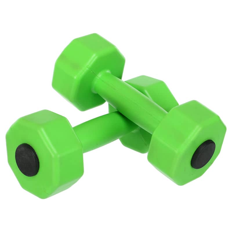 Кожна гантель у комплекті є цілісним вирібом, без будь-яких знімних деталей, забезпечуючи таким чином надійність і безпеку під час занять. Вага однієї пари гантелей становить 2 кг, що ідеально підходить для початківців та для виконання легких вправ.