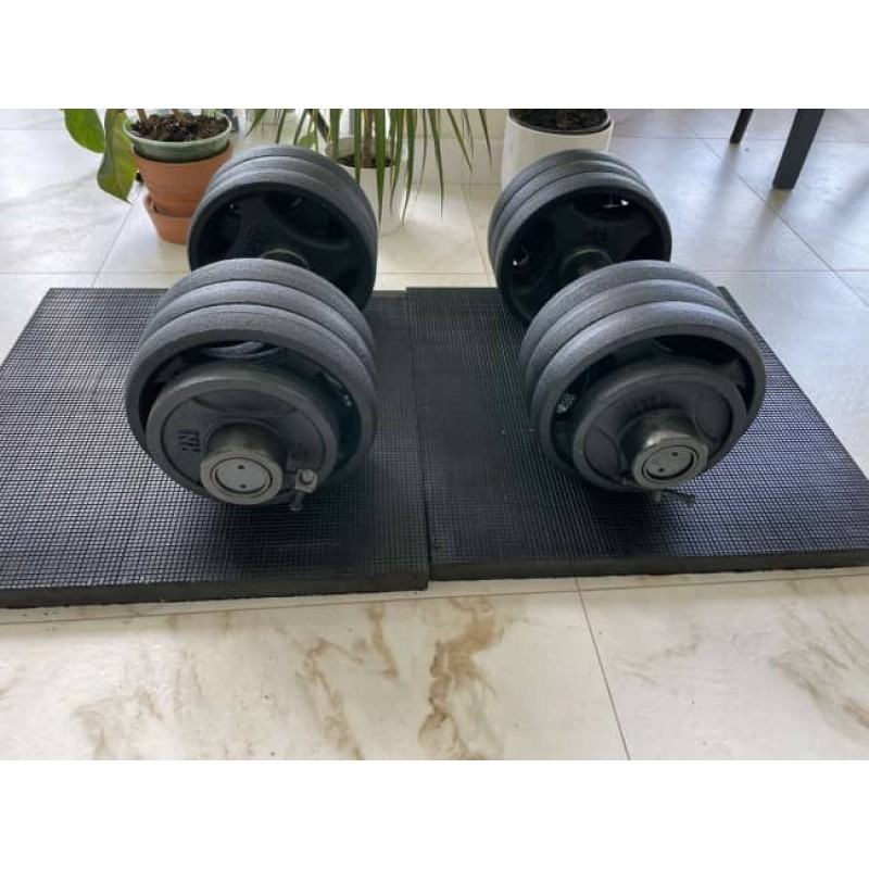 Диски виготовлені із металу. Після обробки диски розігрівають у печі до температури 180-200 градусів, фарбують ударостійкою фарбою і знову запікають до формування міцної кірки. Завдяки дискам вагою 1.25 кг можна тренуватися з мінімальним кроком ваги. Благородності додає повністю металевий, хромований гриф довжиною 35 см, з насічкою проти ковзання рук та двома затискними гайками, які мають гумові втулки для щільної та надійної фіксації дисків.