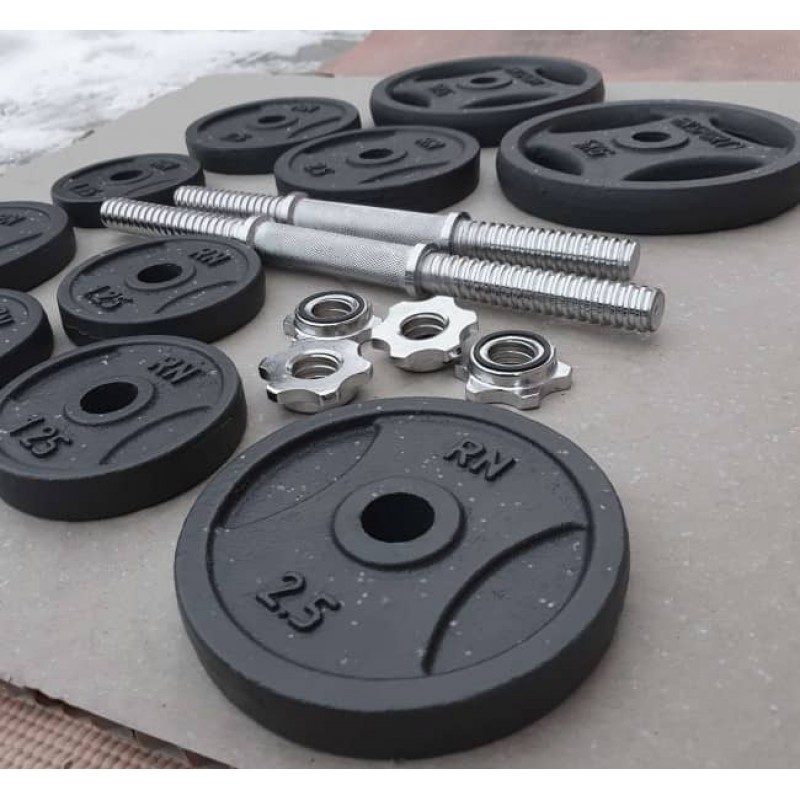 - Шляхом наявності дисків 1,25, 2.5 і 5 кг, Ви з легкістю зможете комплектувати гантелі більшої ваги, докупивши диски на сайті RN-Sport