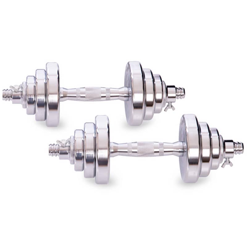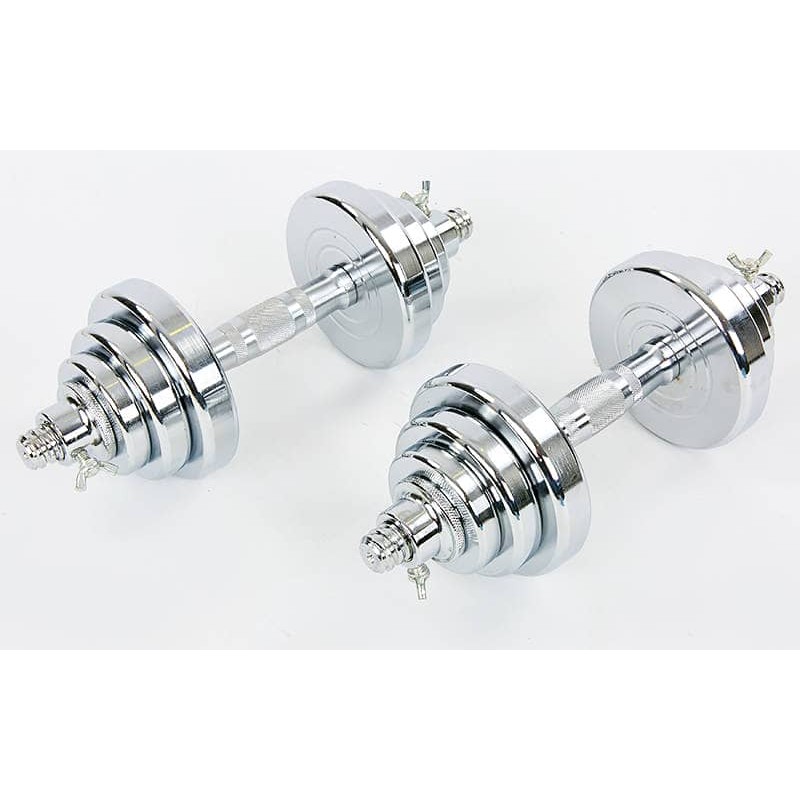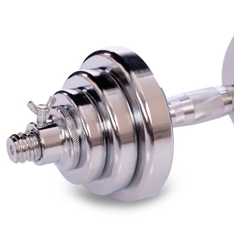 Розбірні гантелі - це один з найпоширеніших снарядів, який широко використовується і в домашніх умовах, і в комерційних спортзалах. З їх допомогою можна пропрацювати практично всю мускулатуру тіла. Можливість змінювати вагу гантелі дозволяє застосовувати її як в базових вправах на кілька груп м'язів, так і в ізолюючих - для окремих м'язових пучків. До того ж ця функція дає можливість варіювати навантаження відповідно до рівня тренованості атлета. Кожна гантель складається з грифа, набору дисків і замків - все елементи виготовлені з високоякісної хромованої сталі. На рукоять грифа нанесені дрібні ромбовидні насічки, що запобігає ковзанню долоні і забезпечує надійний хват. Замок являє собою фіксуючий диск з різьбленням і стопорним гвинтом, що забезпечує надійне закріплення вагових млинців на грифі і, відповідно, безпеку тренувань. Завдяки високотехнологічному виробництву вага гантелей відповідає заявленому і не має похибок.