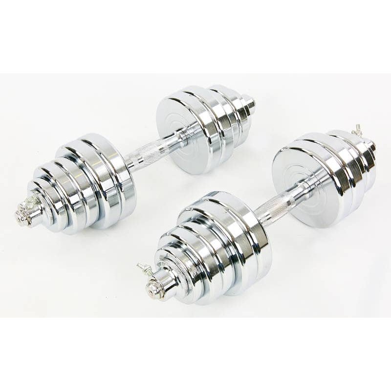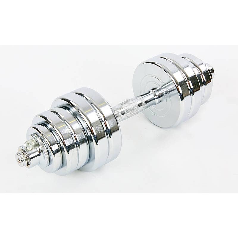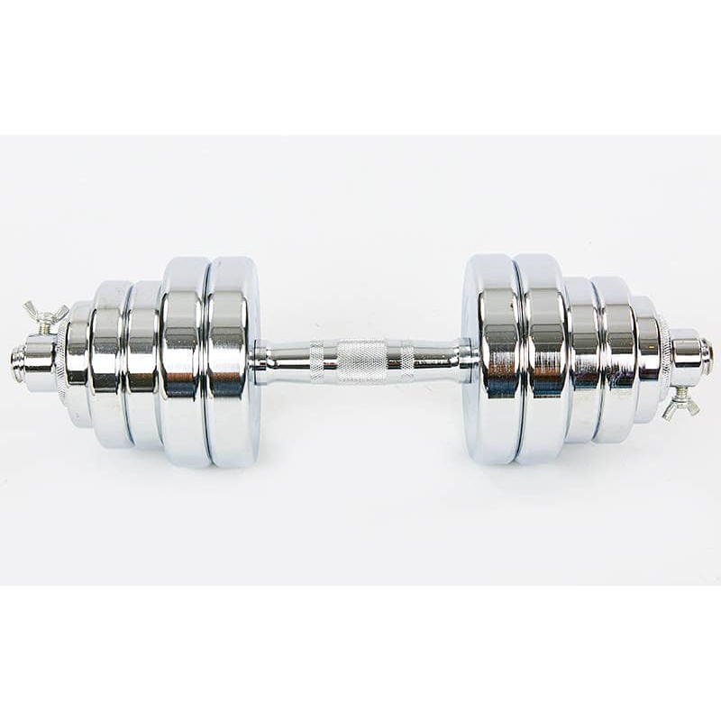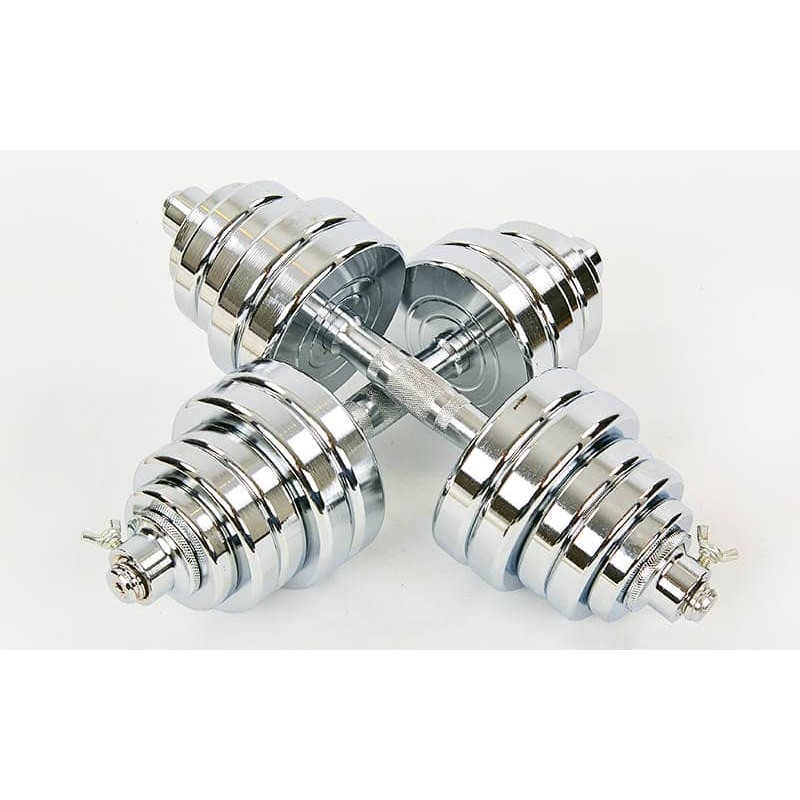 Розбірні гантелі - це один з найпоширеніших снарядів, який широко використовується і в домашніх умовах, і в комерційних спортзалах. З їх допомогою можна пропрацювати практично всю мускулатуру тіла. Можливість змінювати вагу гантелі дозволяє застосовувати її як в базових вправах на кілька груп м'язів, так і в ізолюючих - для окремих м'язових пучків. До того ж ця функція дає можливість варіювати навантаження відповідно до рівня тренованості атлета. Кожна гантель складається з грифа, набору дисків і замків - все елементи виготовлені з високоякісної хромованої сталі. На рукоять грифа нанесені дрібні ромбовидні насічки, що запобігає ковзанню долоні і забезпечує надійний хват. Замок являє собою фіксуючий диск з різьбленням і стопорним гвинтом, що забезпечує надійне закріплення вагових млинців на грифі і, відповідно, безпеку тренувань. Завдяки високотехнологічному виробництву вага гантелей відповідає заявленому і не має похибок.