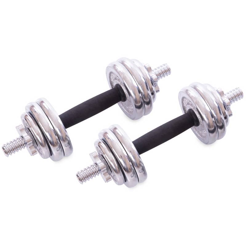 Крім того, в наборі є сполучна муфта, яка дає змогу зібрати з гантелей штангу невеликого розміру. Ручки гантелей не ковзають у руках і забезпечують надійний хват. Диски хромовані та захищені від корозії.