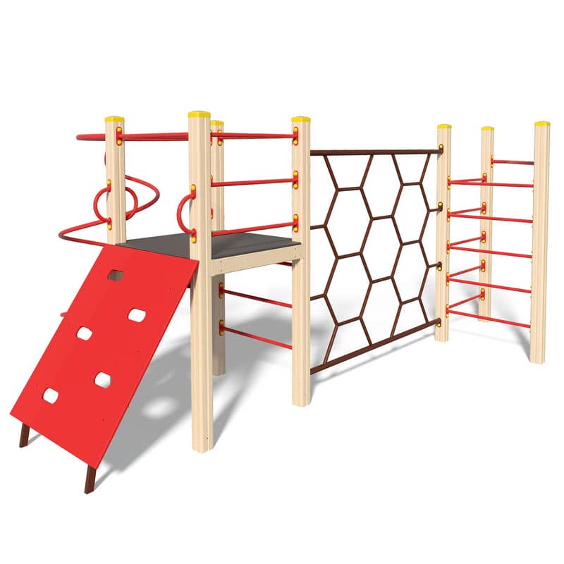 Гімнастичний комплекс "Спорт-1" призначений для розвитку у дітей координації руху, а так само для занять фізичними вправами на відкритому повітрі. Гімнастичний комплекс являє собою єдину конструкцію, яка складається з платформи, спірального спуску, прямих сходів, дошки альпініста і турніка, які закріплені на деревяних брусах.