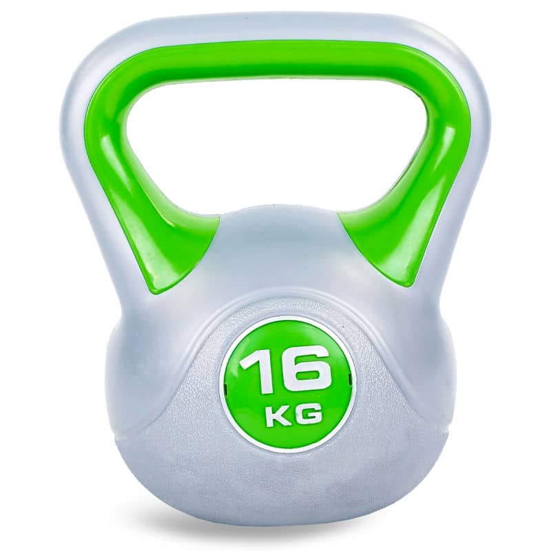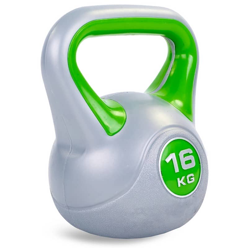 Гиря з пластиковим покриттям невибаглива до умов експлуатації, стійка до механічних пошкоджень і не боїться вологи. Завдяки цьому її можна використовувати як у домашніх умовах, так і у фітнес-клубах і тренажерних залах. Щоб надати снаряду необхідної ваги, виробник використав цементний наповнювач. Покриття гирі виконано методом лиття, що гарантує додаткову міцність під час виконання різних вправ. Основа гирі, як і належить даному інвентарю, має сферичну форму, а руків'я розширюється у верхній частині, на ньому достатньо місця для захоплення. Округлені краї ручки роблять хват зручнішим і дають змогу виконувати вправи, утримуючи гирю різними способами. Вага гирі становить 16 кг.