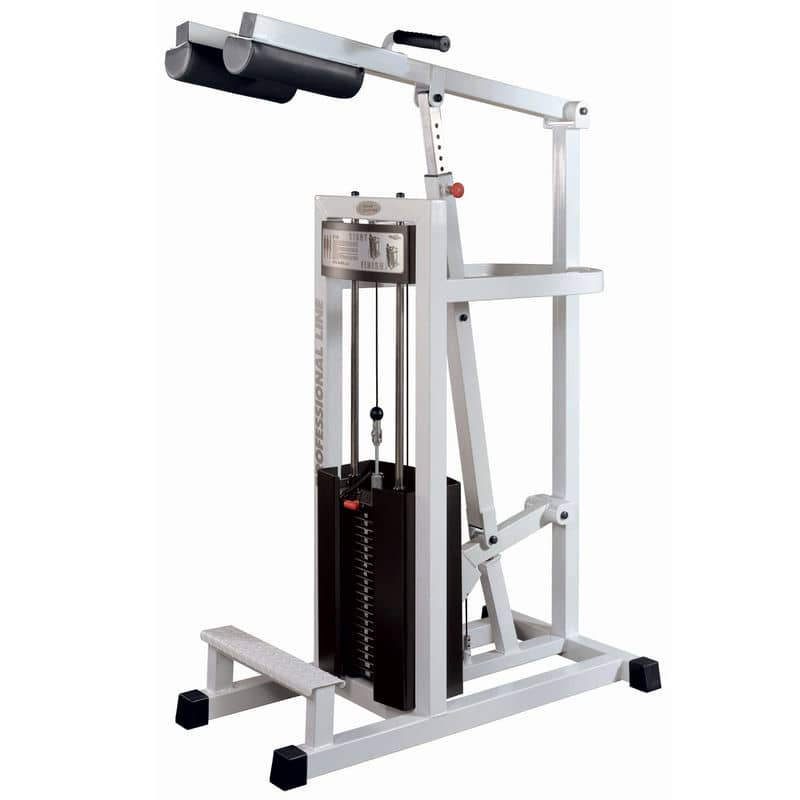 Тренажер призначений для виконання підйому на носок. Початкове положення стоячи, ноги на підставці, опорні валики на плечах, руки лежать на власниках. Виконати підйом на носок і повернутися в початкове положення.
