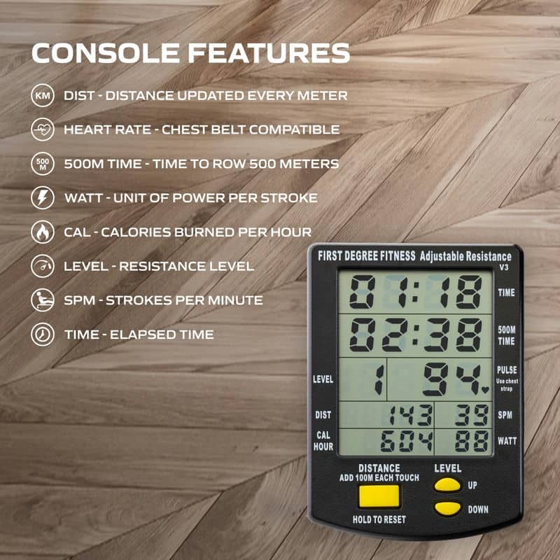 Швидко відстежуйте всі параметри тренування за допомогою простого, але повноцінного LCD монітора. Кут огляду можна відрегулювати за бажанням, щоб ваші результати завжди були добре видно. Додайте 100 метрів до своєї тренувальної мети одним натисканням кнопки або відрегулюйте рівень опору до рівня, встановленого вами за допомогою регулювального диска на резервуарі для води.