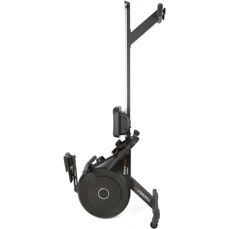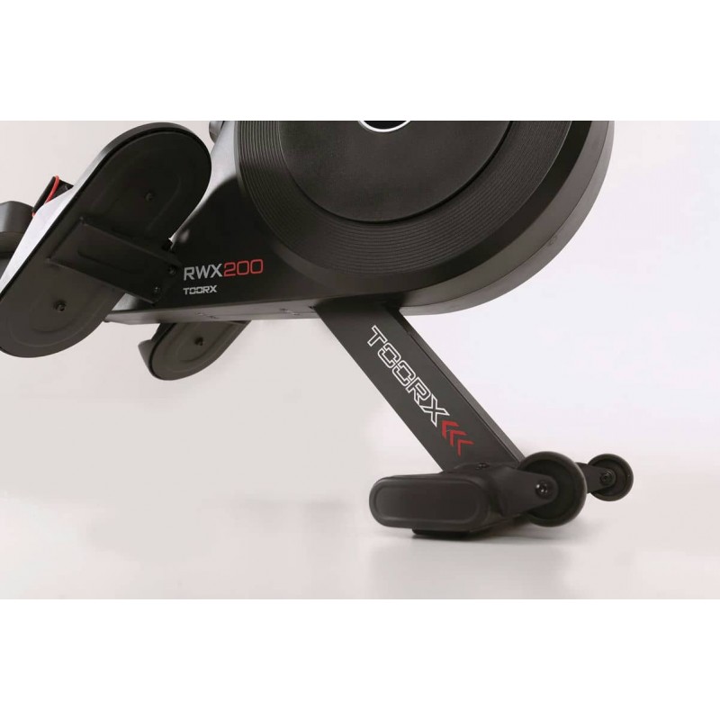 Гребний тренажер Toorx Rower RWX 200 (RWX-200) від італійського виробника Garlando S.p.A. призначений для комплексного кардіотренування в домашніх умовах. Тренажер має 12-рівневе ручне регулювання навантаження, а також простий у використанні комп'ютер. 5-кілограмовий маховик завдяки магнітній системі гальмування забезпечує оптимальну амплітуду рухів, а повітряна система опору імітує відчуття веслування на воді. Гребний тренажер розрахований на вагу до 120 кг, а його сидіння на роликах ковзає по алюмінієвій напрямній, гарантуючи необхідний комфорт навіть за тривалих вправ. Вбудований приймач для бездротового датчика вимірювання пульсу буде доречним під час тренування для контролю частоти серцевих скорочень. Складана конструкція тренажера заощаджує місце та дозволяє розмістити його навіть на мінімальній площі, яка потрібна для занять спортом.