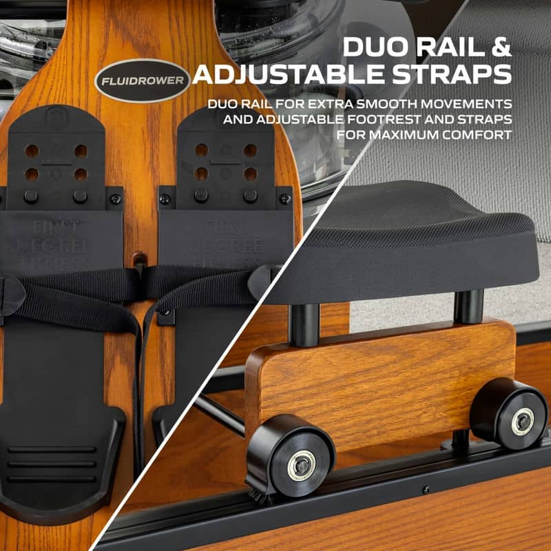 Fluid Bluetooth Monitor дає миттєву інформацію про всі ваші параметри тренування, такі як час, вати, калорії, відстань та кількість гребків за хвилину. Крім того, монітор автоматично відображає рівень опору, який ви встановили за допомогою циферблата на тренажері веслування. Ви також можете підключитися до тренувальних програм, таких як Fluid Connect, Regatta, Asensei, EXR та Kinomap, за допомогою Bluetooth.