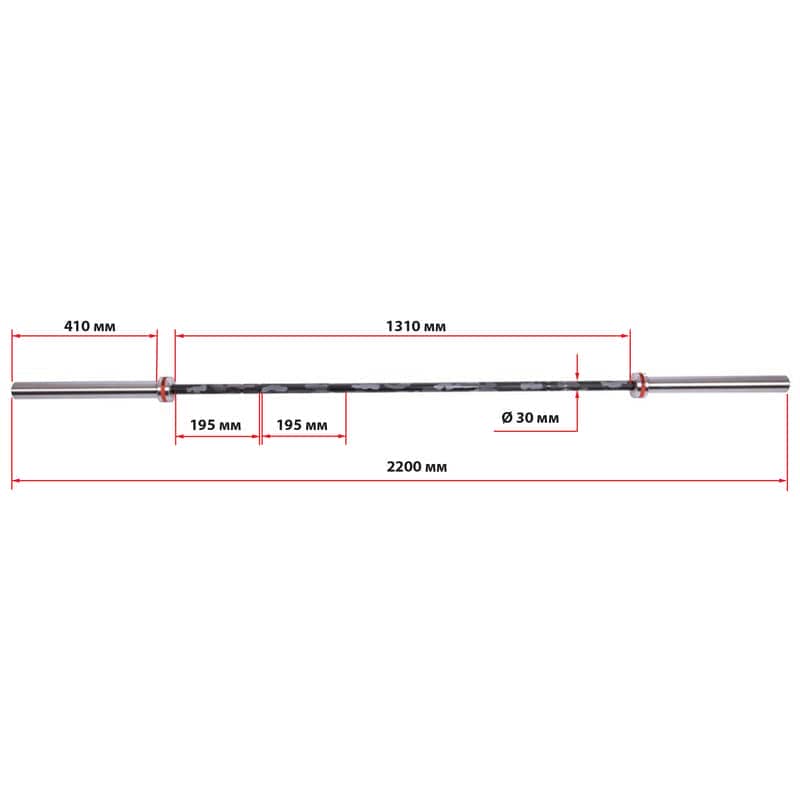 Цей якісний інвентар важить 20 кг, має стандартний діаметр втулки 50 мм і довжину 220 см. Діаметр грифа зручний для захоплення і становить 28 мм. Гриф виготовлений з міцного металу, а на його поверхні є насічки, які сприяють комфортному захопленню і запобігають вислизанню штанги з рук.