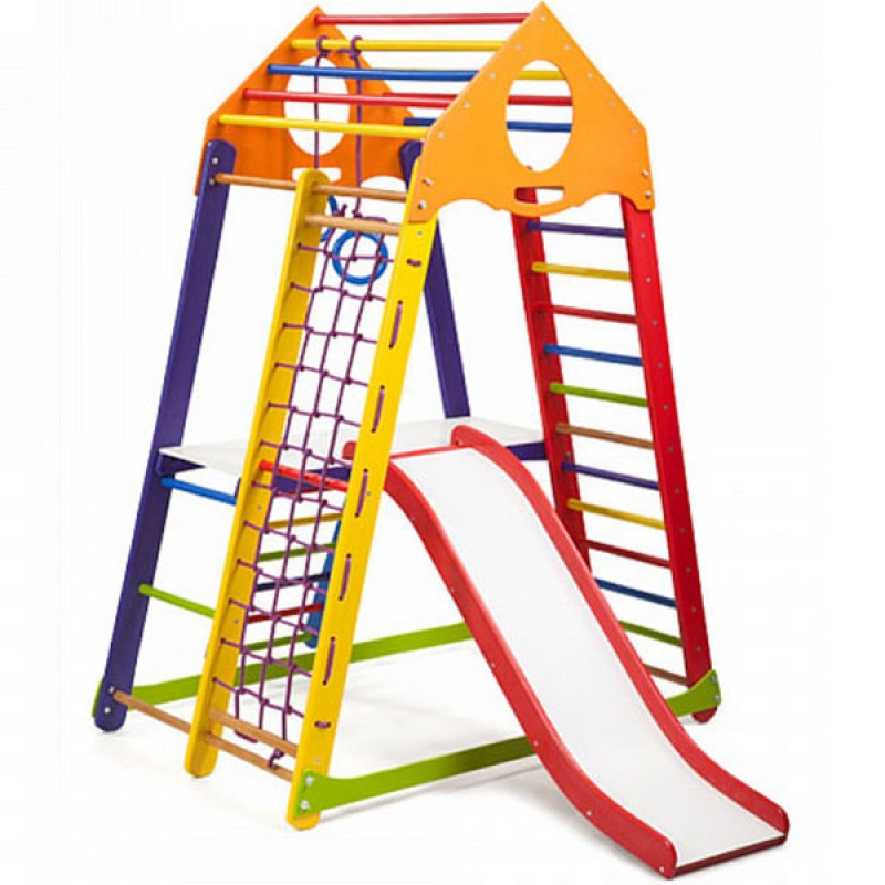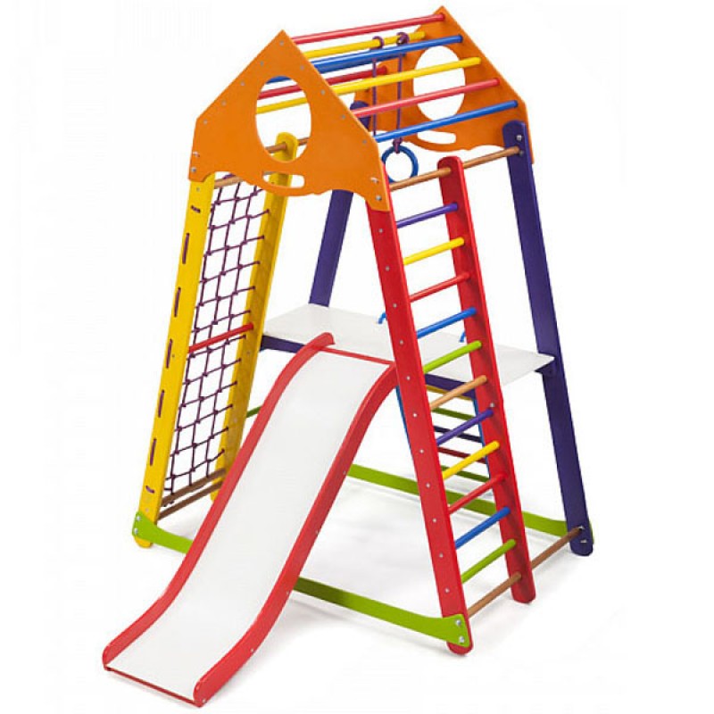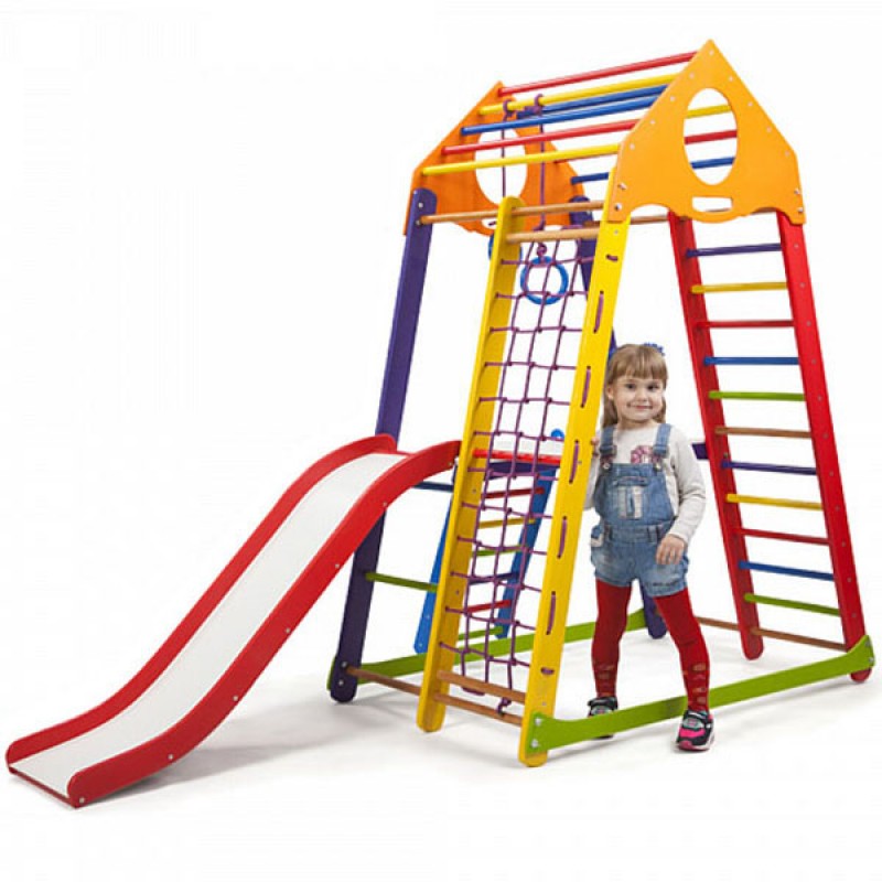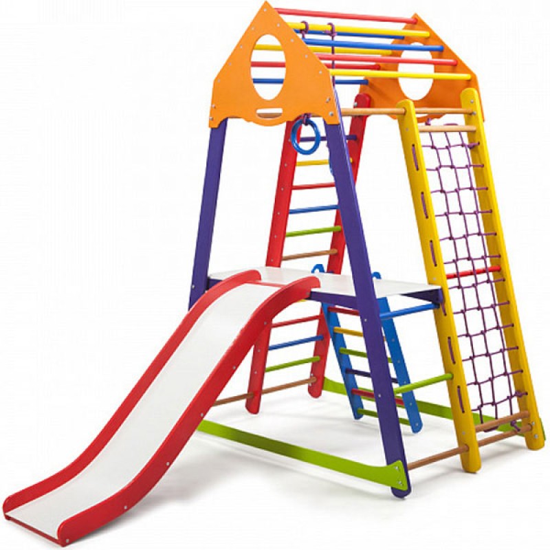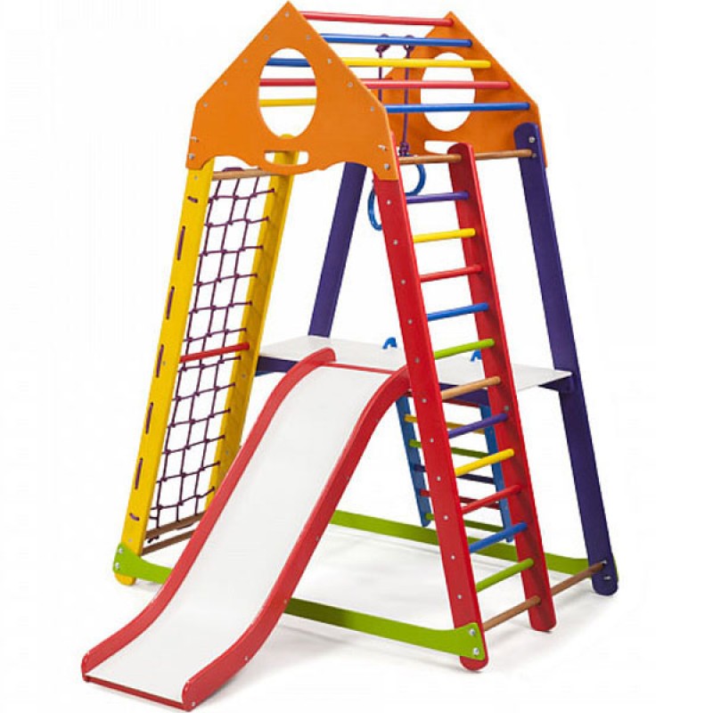 Багатоцільовий дитячий спортивний комплекс BambinoWood Color Plus 2 створений компанією PLAYBABY для дітей молодшої вікової групи (3-7 років). Оснащення спортивними снарядами і предметами для ігор проводилося на основі рекомендацій фахівців з дитячої психології і фізичного виховання. Компактність і модульність конструкції дозволяє використовувати дитячий куточок як при облаштуванні ігрових майданчиків на відкритому повітрі, так і в приміщеннях. Спортивно-ігровий тренажер оснащений всім необхідним навісним і нерухомим устаткуванням, яке може знадобитися для спортивних занять та рухливих ігор. Гірка легко знімається і не заважає виконанню гімнастичних вправ. Пересувна навісна драбинка і настили полегшують доступ до снарядів. Для виготовлення несучих опор і сполучних елементів застосовується зріла деревина сосни. Поперечини сходів виточуються з високоякісного бука. Мотузкові сходи і підвіски гімнастичних кілець виготовляються з міцних синтетичних шнурів. Металеве кріплення закривається пластмасовими ковпачками. Всі поверхні добре простругані, відшліфовані і пофарбовані яскравими фарбами, що надає виробу привабливий вигляд і запобігає отриманню травм під час ігор і тренувань. Монтаж дитячого спортивно-ігрового комплексу не вимагає спеціальних кріплень. Вага користувача: 60 кг. Довжина гірки: 130 см.