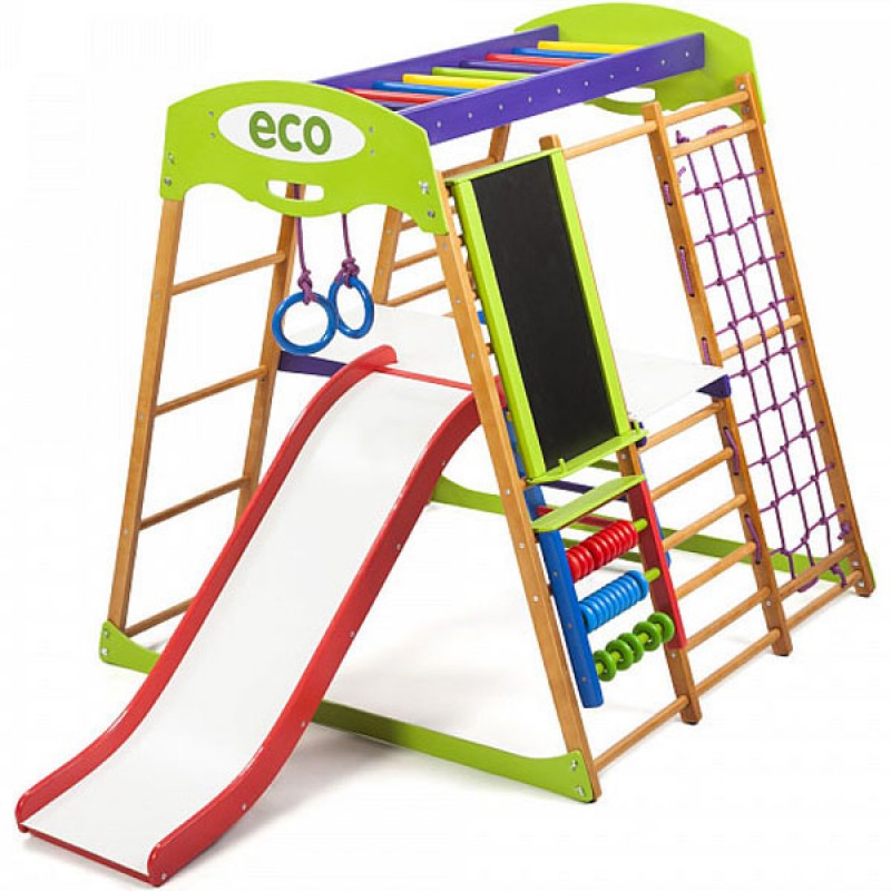 Діти дуже потребують рух, тому вкрай важливо задовольняти цю потребу організму, що росте. Як це зробити? Відповідь, насправді, дуже проста: досить купити для квартири дитячий спортивний комплекс Карамелька plus 3 і поставити в кімнаті малюка. Така конструкція не тільки подарує море позитивних емоцій дитині, але і принесе дуже багато користі. Споруда оснащена декількома елементами, які всебічно розвивають малюка. До того ж, тут є не тільки спортивне обладнання. Для того, щоб малюк навчався основам математики, в комплекті є кольорові рахунки. А для розвитку творчих здібностей передбачений мольберт. Зміцнюватися фізично дитині допоможе таке обладнання як шведська стінка, гладіаторська сітка, рукохід, драбинка, гімнастичні кільця і улюблена всіма дітьми гірка. Також є столик для проведення більш спокійних ігор або для відпочинку. Конструкція зроблена з натуральних матеріалів, а також є абсолютно безпечною для дітей. Завдяки своїм компактним розмірам, спорткомплекс поміститься в маленькій квартирі і буде доречно виглядатиме в дитячій кімнаті. Матеріал: береза. Перекладини: бук. Гімнастичні кільця: пластик. Вага користувача: 60 кг. Довжина гірки: 130 см.