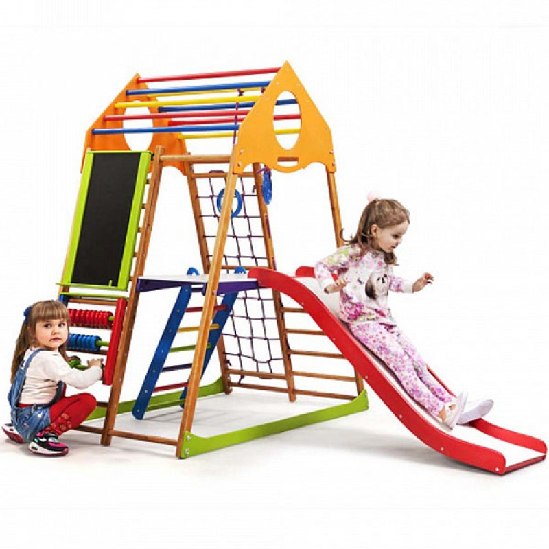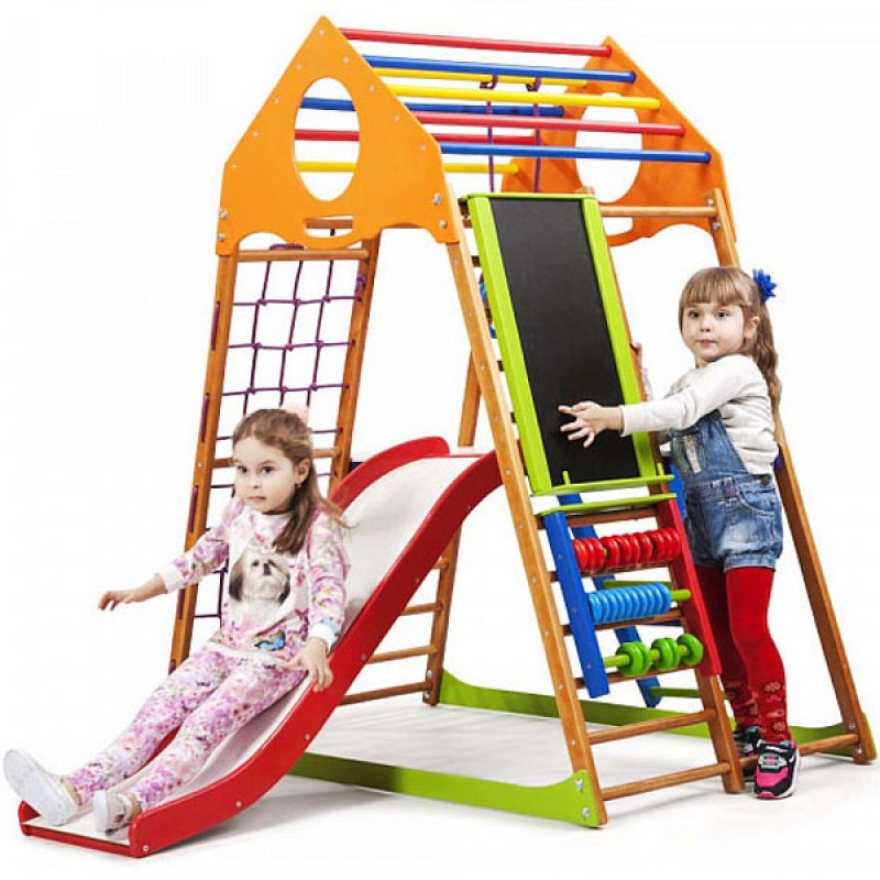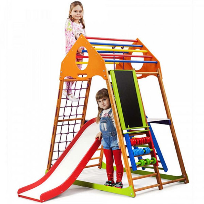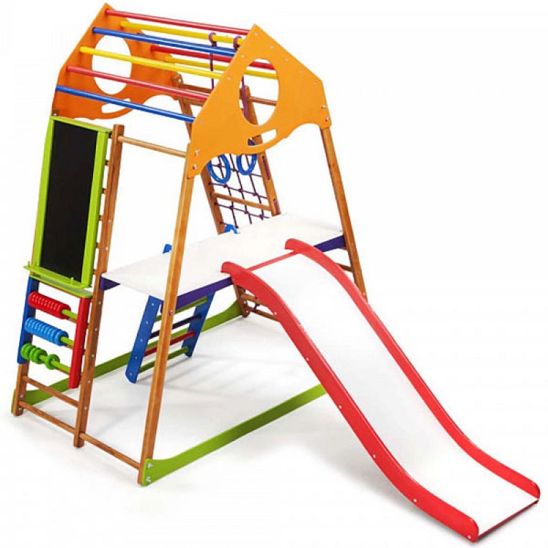 Наскільки важливий спорт для дитини - це відомо всім дорослим. Особливо добре, якщо фізичні навантаження поєднувати з прогулянкою на свіжому повітрі. Однак не завжди є така можливість через погодні умови або інших чинників. Для таких випадків пропонуємо дитячий спортивний комплекс для дому KindWood Plus 3 встановити у себе вдома або в іншому зручному для Вас приміщенні. Це дозволить дитині займатися спортом і просто весело проводити час, коли завгодно. Даний снаряд оснащений усіма необхідними елементами для повноцінного фізичного, а також інтелектуального розвитку дітей. Тут є шведська стінка, гладіаторська сітка, рукохід, дитяча гірка, столик, гімнастичні кільця, рахунки "кольорові" та навіть мольберт. Завдяки невеликим розмірам він буде доречним навіть в маленькій квартирі. Його висота - 150 см, а ширина - 85 см. Виконано вироби з якісних і натуральних матеріалів. Спортивний комплекс відповідає всім вимогам безпеки. Регулярно займаючись на такому мультифункціональному тренажері, малюк буде поступово покращувати стан свого здоров'я, зміцнювати м'язи, розвивати силу, спритність, мислення. Матеріал: береза. Перекладини: бук. Гімнастичні кільця: пластик. Вага користувача: 60 кг. Довжина гірки: 130 см.