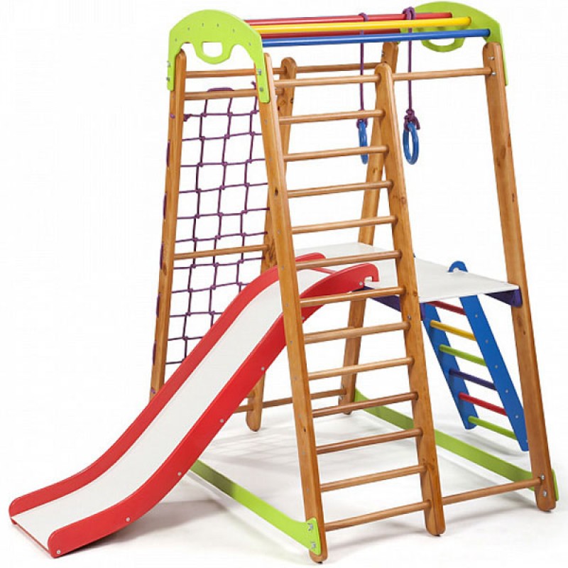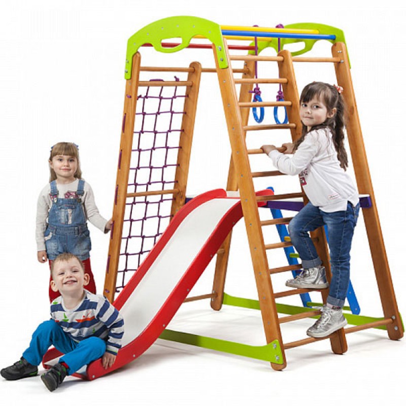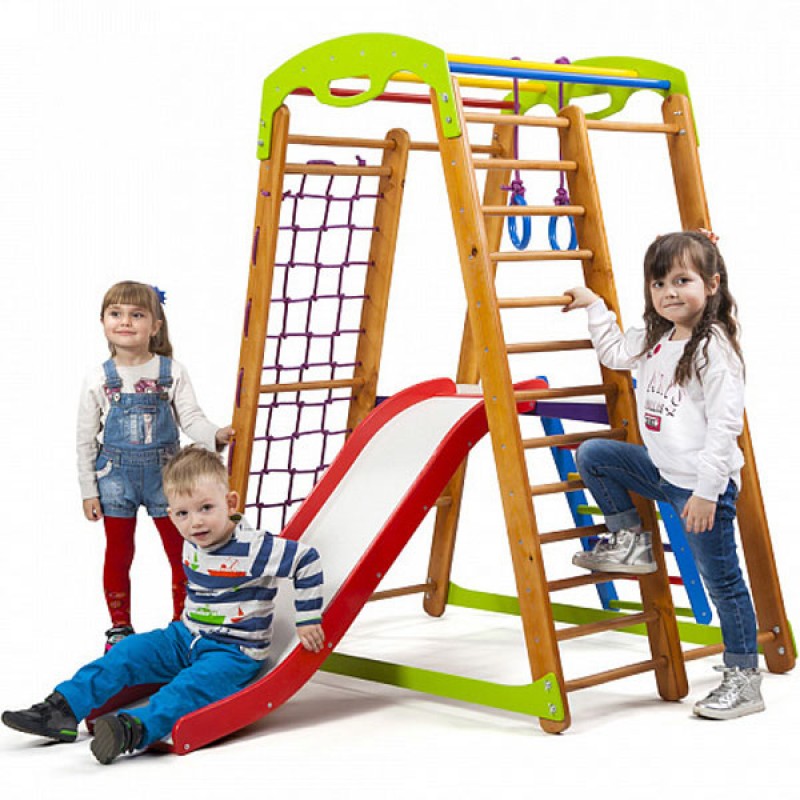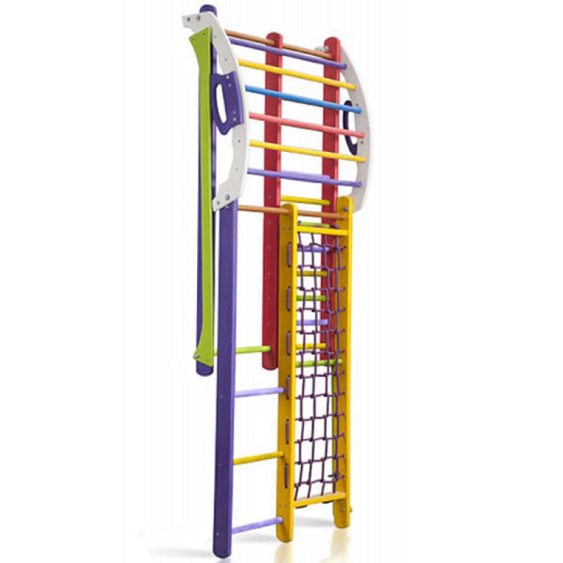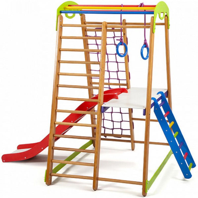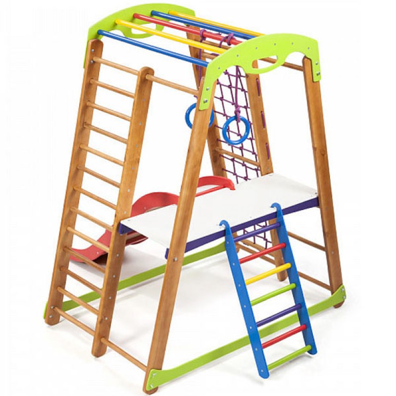 Здорова і міцна дитина - це мрія будь-якого батька. А для того, щоб це було реальністю, необхідно привчати свого малюка до корисних звичок ще в ранньому віці. Ми рекомендуємо придбати дитячий спортивний куточок Кроха-2 plus 2 і подарувати дитині можливість розважатися і одночасно займатися спортом прямо у себе вдома. Це відмінне рішення, так як прогулянка на вулиці не завжди можлива з різних причин. Це спортивно-ігровий комплекс, який підходить для дітей дошкільного віку. На ньому також можуть займатися старші хлопці. Головна умова - максимальна вага користувача не повинна бути більше 60 кг. Тут є все необхідне, щоб малюк отримував повноцінне фізичне навантаження: спортивна стінка, рукохід, кільця, гладіаторська сітка. Для того, щоб дитина відпочила після рухливих ігор в комплекті є столик. А така споруда як гірка не залишить жодного малюка байдужим. Спорткомплекс дає переваги не тільки дитині, а й батькам. Поки чадо весело проводить час вдома, дорослі можуть займатися своїми справами, і одночасно доглядати за малюком. Матеріал: сосна. Перекладини: бук. Гімнастичні кільця: пластик. Вага користувача: 60 кг. Довжина гірки: 130 см.