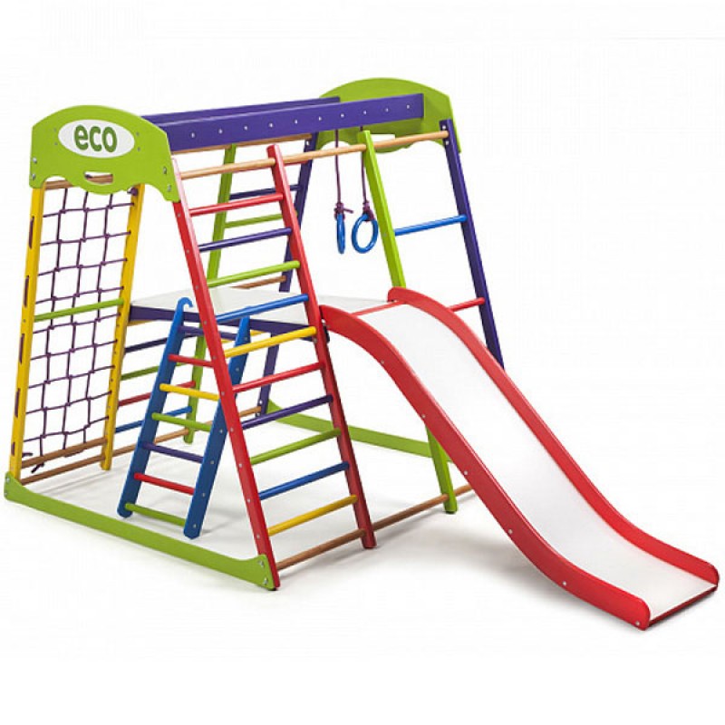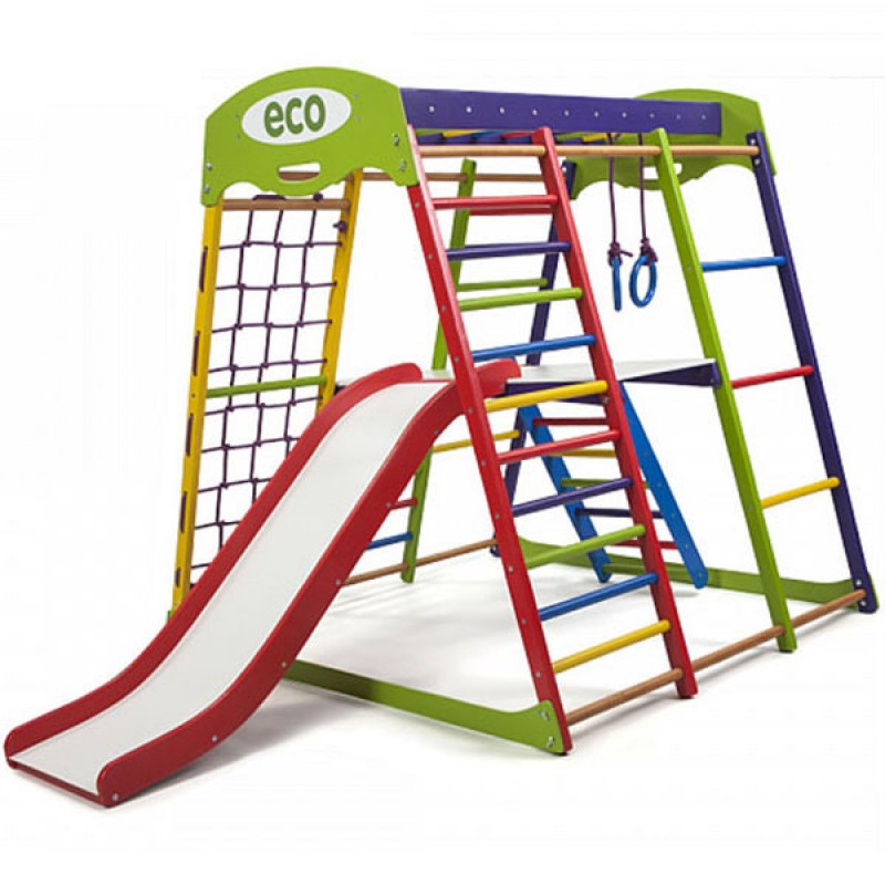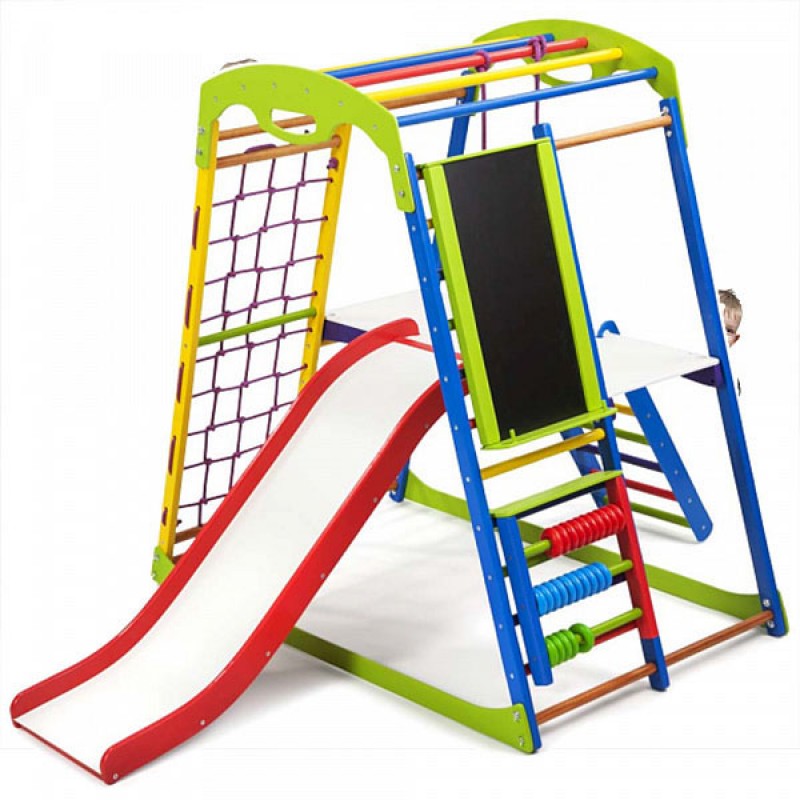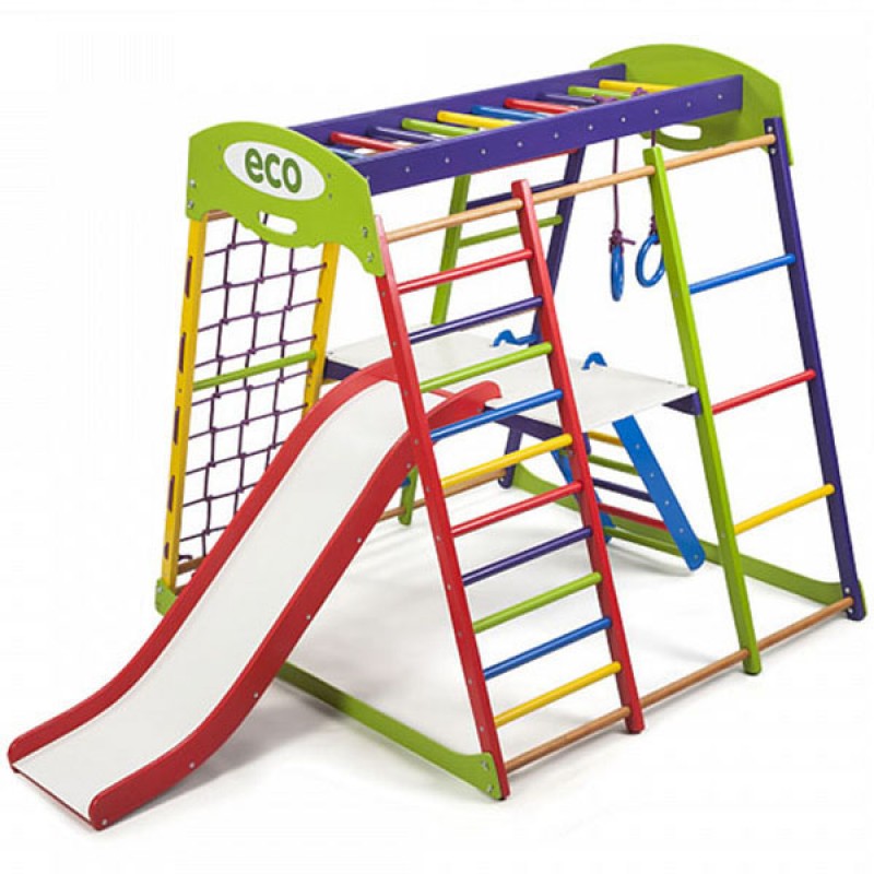 Спорт грає важливу роль для дитини з перших років і навіть місяців. Якщо батьки вчасно не подбають про фізичний розвиток малюка, це може негативно відбитися на його здоров'ї. На щастя, сьогодні можна привчити дитину до спорту в домашніх умовах. Для цього достатньо придбати спортивний комплекс для будинку Юнга Plus 2. Тут він буде грати і добиватися своїх перших успіхів у спорті. Дана конструкція являє собою міні-спортзал для малюка. У ньому є таке багатофункціональне обладнання як шведська стінка. Також дитина зможе тренувати м'язи рук, плечового пояса, зміцнювати опорно-руховий апарат за допомогою рукохіду. А гладіаторські сітка - це хороша профілактика плоскостопості, до того ж, коли малюк забирається по ній нагору, він немов домагається успіху і стає більш впевненим у своїх силах. Крім усього іншого, в розпорядженні дитини такі елементи як гімнастичні кільця, столик, гірка і драбинка. Матеріал, з якого виготовлена конструкція є якісним і натуральним. Юнга Plus 2 відрізняється яскравими насиченими кольорами, тому сподобається всім дітям, а дорослі обов'язково оцінять його компактні розміри. Матеріал: береза. Перекладини: бук. Гімнастичні кільця: пластик. Вага користувача: 60 кг. Довжина гірки: 130 см.