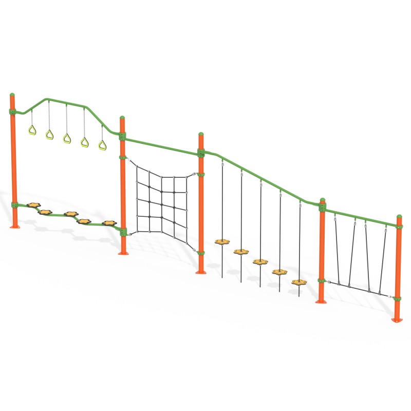 Канатний комплекс вироблений в задумі стежинки з різними перепонами, які з цікавістю долатиме дитина. Обладнання складається з опор, встановлених паралельно одна одній, канатної сітки, вертикально (у виді трапеції) натягнутих канатів, платформ різної форми для перестрибування та канатів у верхній частині виробу зі зручними ручками.