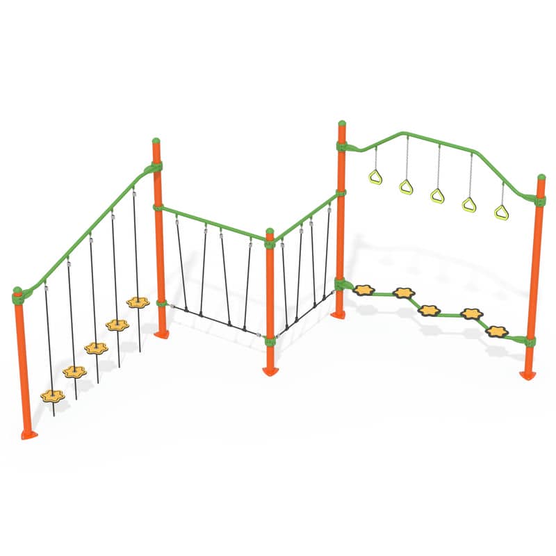 - Обладнання складається із металевих опор, що встановлюються методом бетонування, канатів, які натягуються на опору за допомогою спеціальних кріплень, високоякісних пластикових платформ.